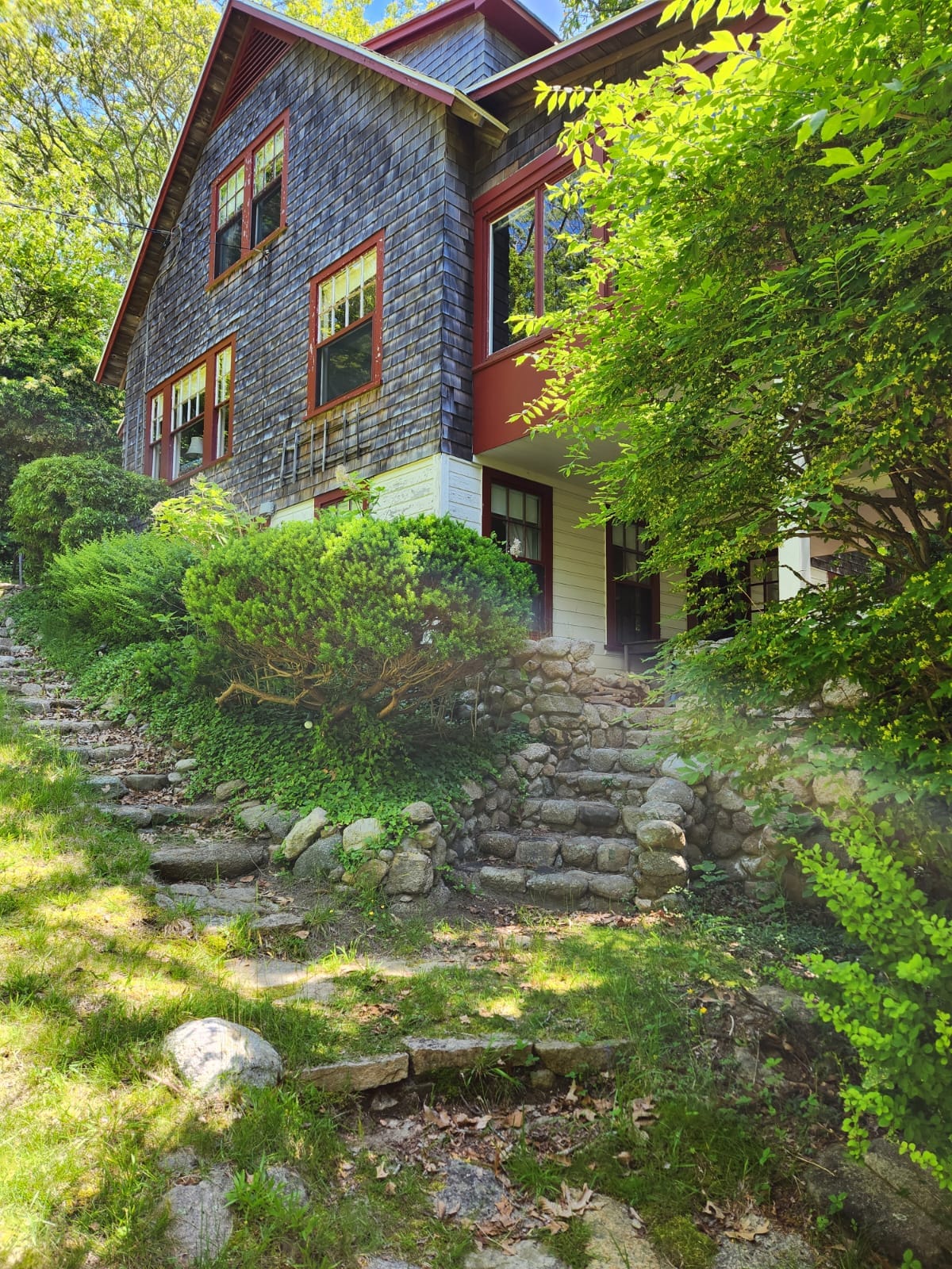 The garden that surrounds the house is inviting, restful, and expansive. The house is surrounded by green, birds and birdsong in the summer, glorious colors in the spring, summer, and fall, and often, spectacular white with brilliant blue sky in the winter. The house has the feeling of an oasis but is near science, music, the Shining Sea Bike and Walking Trail, and great places to have a drink or a meal. The house is very private, on a winding dirt road one block long between paved streets off the main road to Woods Hole. In the gravel parking area next to the house there is room for 3-4 cars.