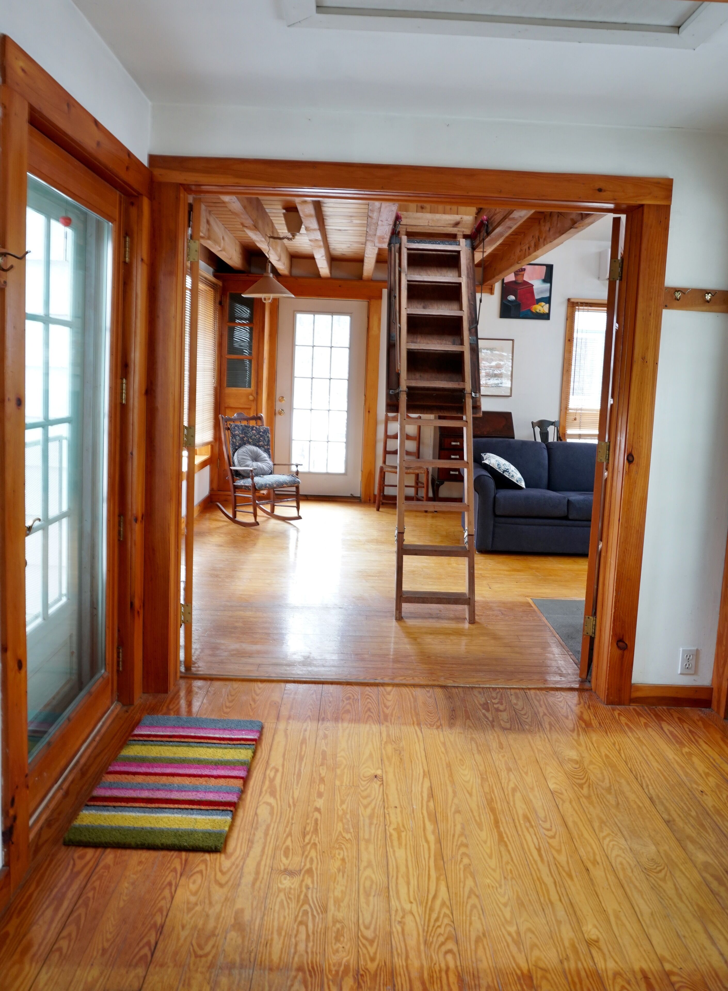 The original interior is full of warm, knotty pine walls, hardwood floors, and a wood-burning fireplace. In the fall of 2013, I converted an adjoining artist studio to a Great Room. It now has cathedral pine ceilings, wood beams, and light pine floors. It also houses a down-filled Room & Board sofa and chaise, a ping-pong table, a gas woodstove, and a 55' television with cable TV.