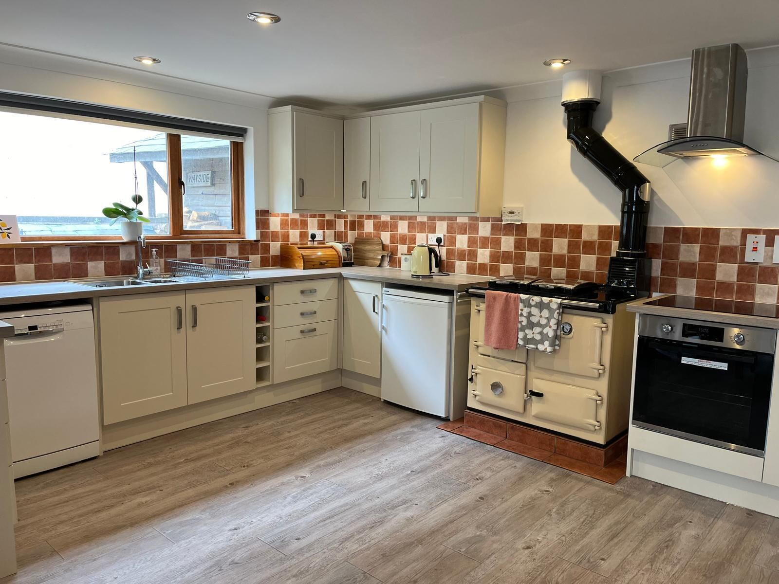 The kitchen is fully equipped with all the necessary amenities such as toaster, kettle, coffee machine, hob, oven/microwave combo, fridge, small freezer and air fryer, along with plenty of kitchen utensils and crockery.