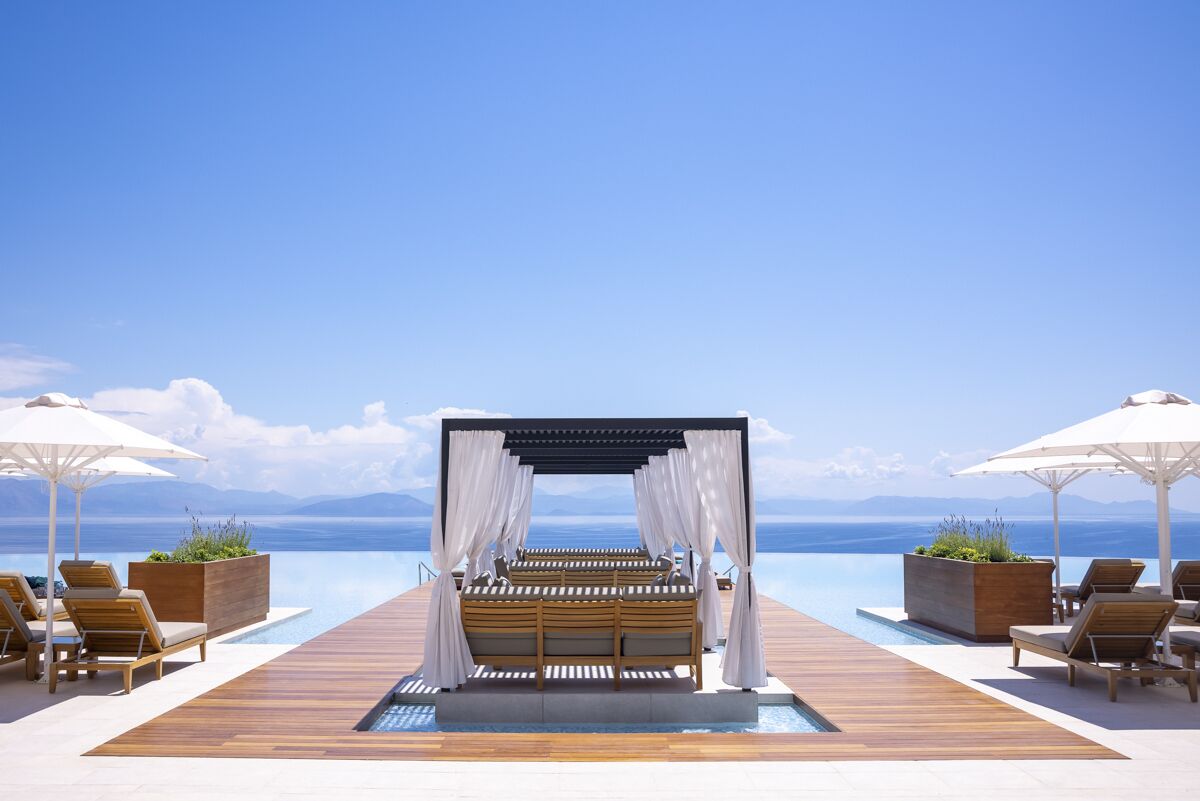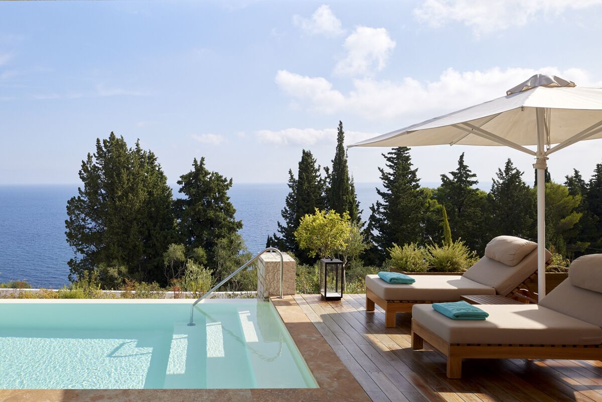 The pool terrace has an alfresco shaded dining pavilion with a table and chairs to seat up to six guests, perfect for outdoor entertaining. The private infinity swimming pool has easy entry steps, and views over the Ionian Sea. The pool is surrounded by comfortable sun loungers for those relaxing days soaking up some rays. There is also a seating area with cushioned armchairs, the perfect place to sit and sip a cocktail or two as the evening sun sets over the horizon.