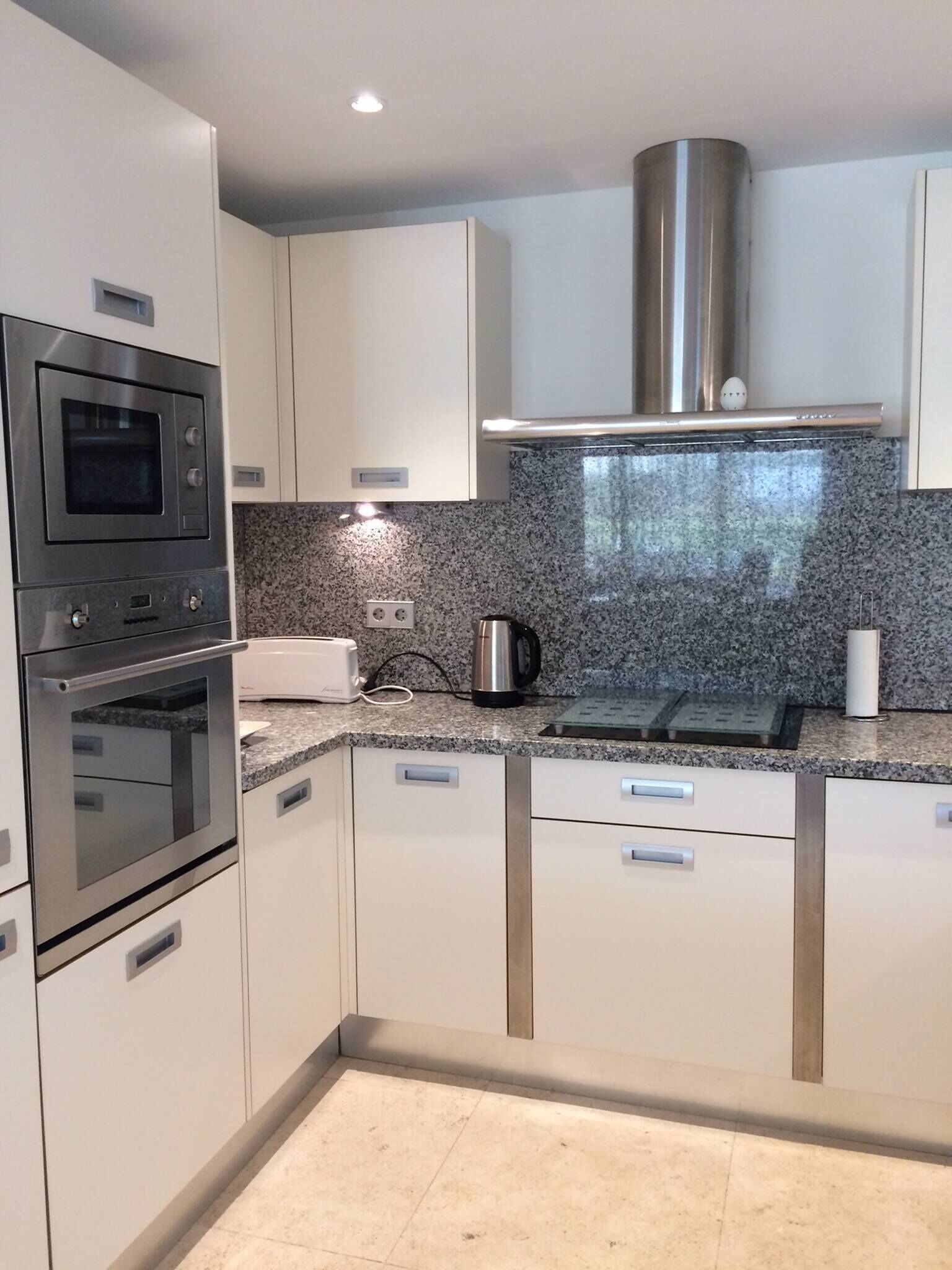 The kitchen is fully equipped. Washing machine, dishwasher, fridge/freezer. The built-in oven, microwave, and ceramic hob are ideal if you fancy cooking rather than eating out. Contemporary white and glass cabinets and granite worktops. A breakfast bar with stools, for those relaxed mealtimes. The kitchen leads onto a private kitchen courtyard.