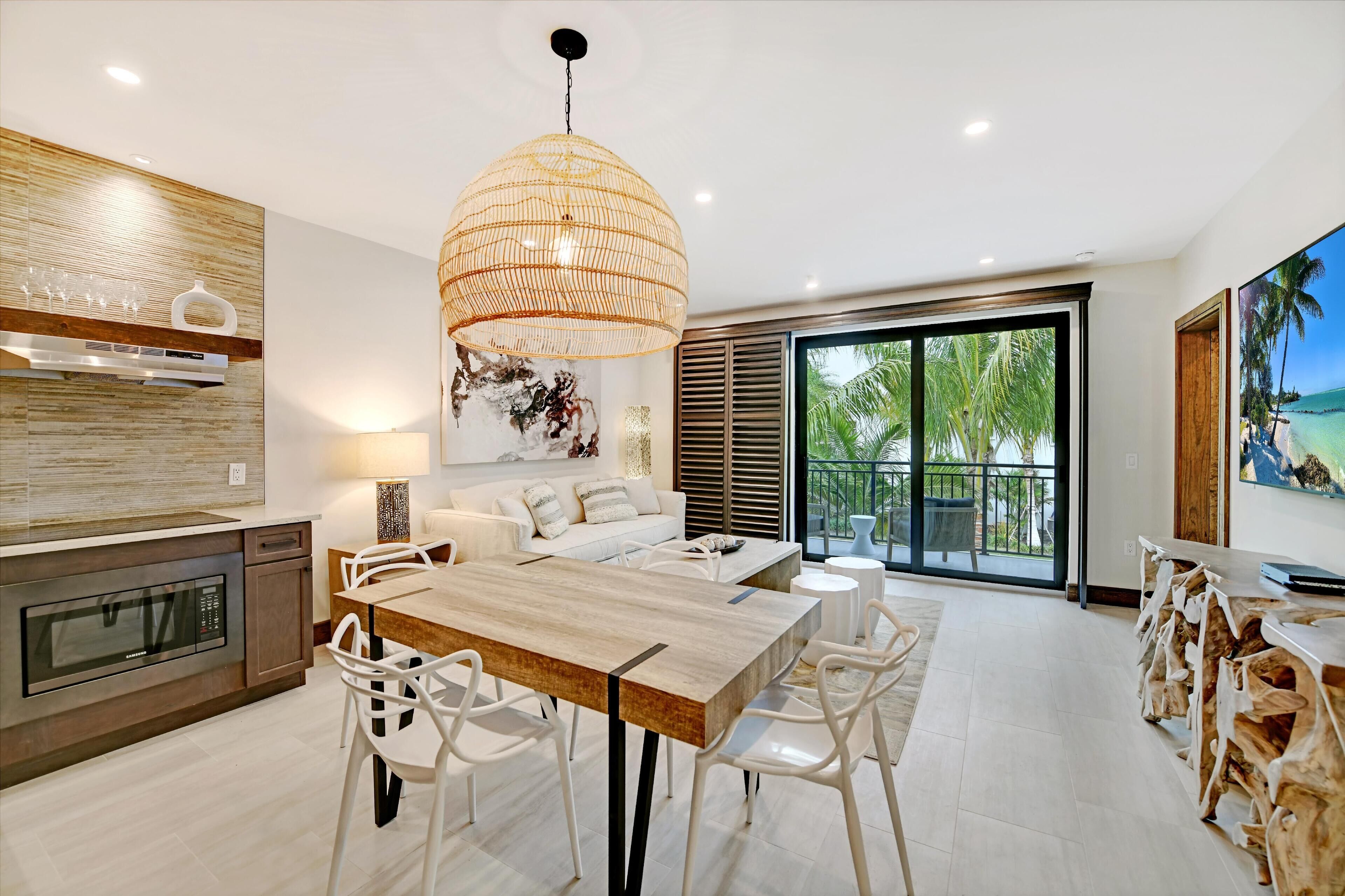 Sip your after-dinner coffee or cocktail on the terrace while gazing out into our verdant resort grounds and sun drenched pool area. These BRAND NEWluxury suites arepoolside and just steps away from our private beach with 2bedrooms and 2 full baths, and havea full kitchen as well as living/dining area. Lavishly designed with the guests comfort in mind, these rooms feature one King (1 King) canopy bed as well as two queen beds (2 Queen) with superior bedding, huge smart TVs in both bedrooms as well as the living room, cypress root tables, carved wood accents, and all the comforts of home. Wood grain tile and floating shelves adorn the newly designed kitchen. These suites are ideal for travel companions, friends, and families. Both full private bathrooms feature smart lighting with back-lit LED mirrors, tub/shower combo, and come with complimentary toiletries. The suite provides a spacious, furnished patio or balcony with views of the pool and a convenient separate living area with a queen pull-out sofa. Room amenities include hair dryer, iron/ironing board, fridge/freezer, countertop stove, microwave, beach/pool towels, wi-fi, cable television, and full use of all on-site amenities like heated pool, parking, beach loungers and umbrellas, and spa/massage services. This room can accommodate up to 8adults.