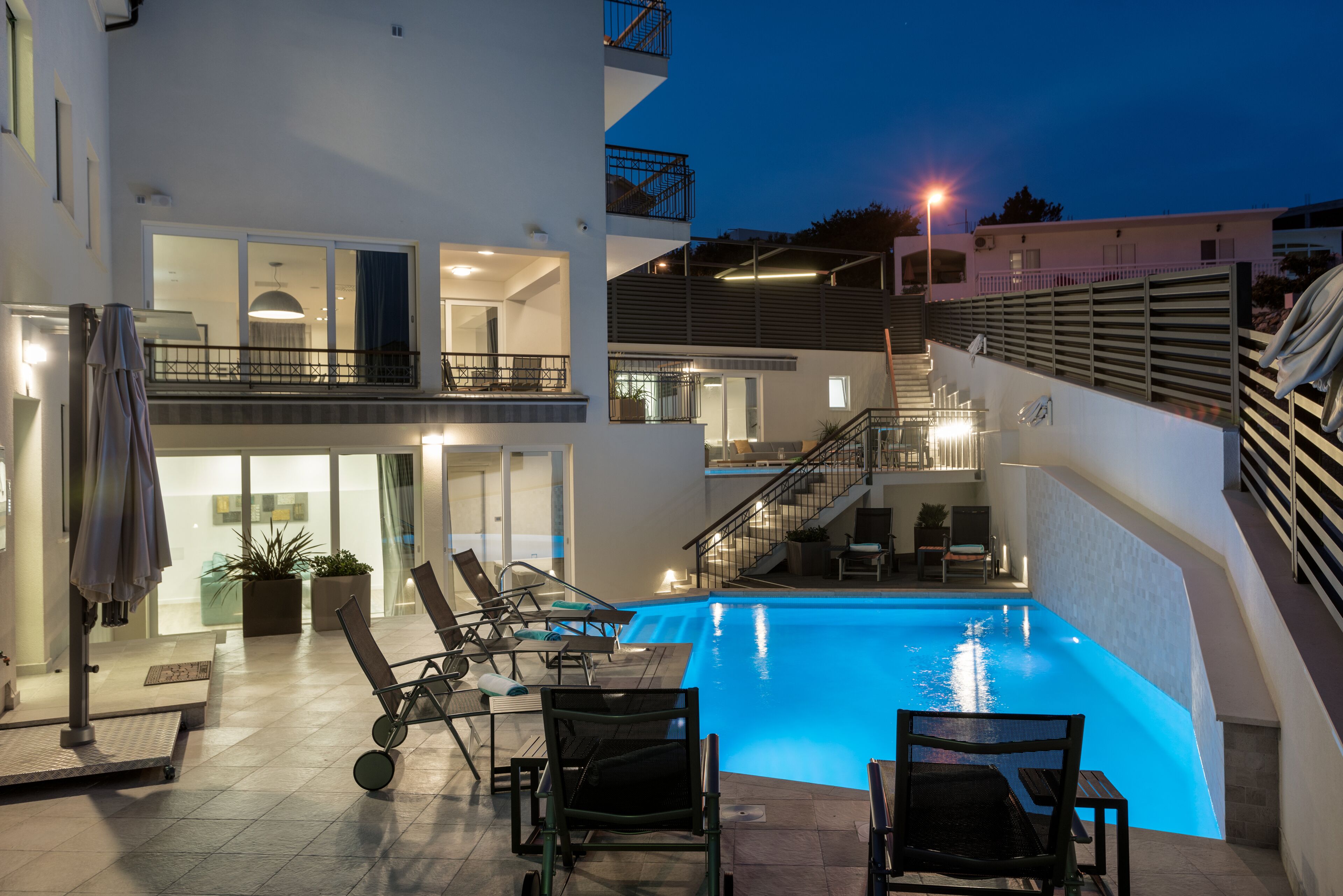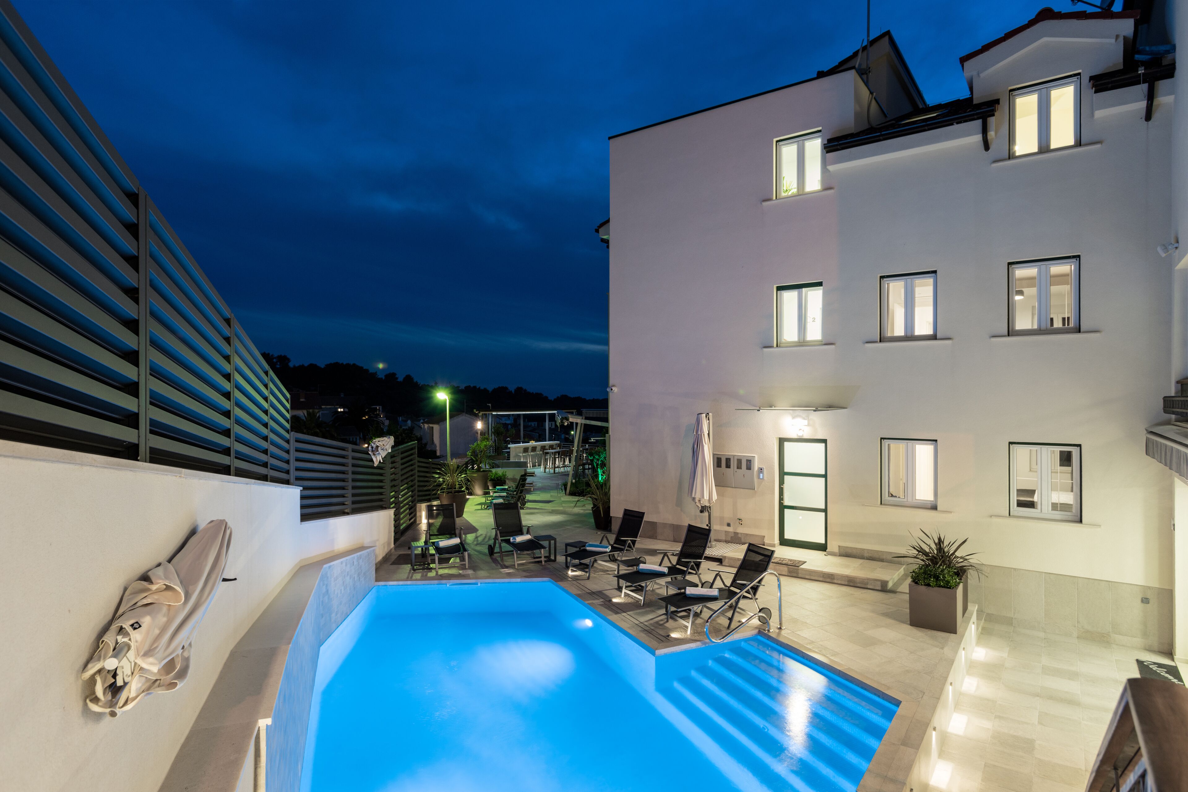 Our resort is one of a kind, unique place located in Hvar, just 900 meters from city center, and only 400 meters from beach. It has an original interior, spacious rooms with terraces, 2 pools with massage, stylish furniture, relaxing and sunbathing area with automatized marquee, surround speakers, private and monitored parking, breakfast area, outside bar, reception, and playstation area. Photos of our Resort speak more than words.