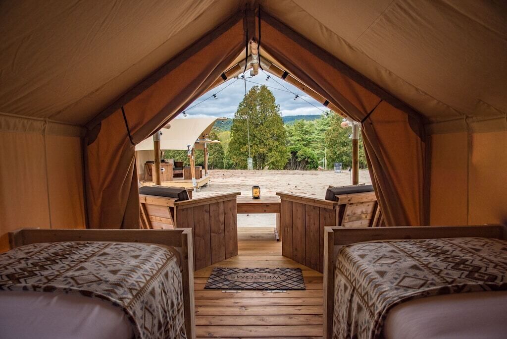 Roaring Brook Ranch is a unique Lake George vacation rental in upstate New York. Guests will experience an authentic ranch retreat and is the perfect destination for those looking to explore the nearby Adirondacks. This stunning glamping tent rental near the Adirondack Mountains has great facilities, including an indoor and outdoor pool, as well as access to activities such as hiking, basketball, volleyball, and tennis to keep guests entertained during their entire stay in New York.