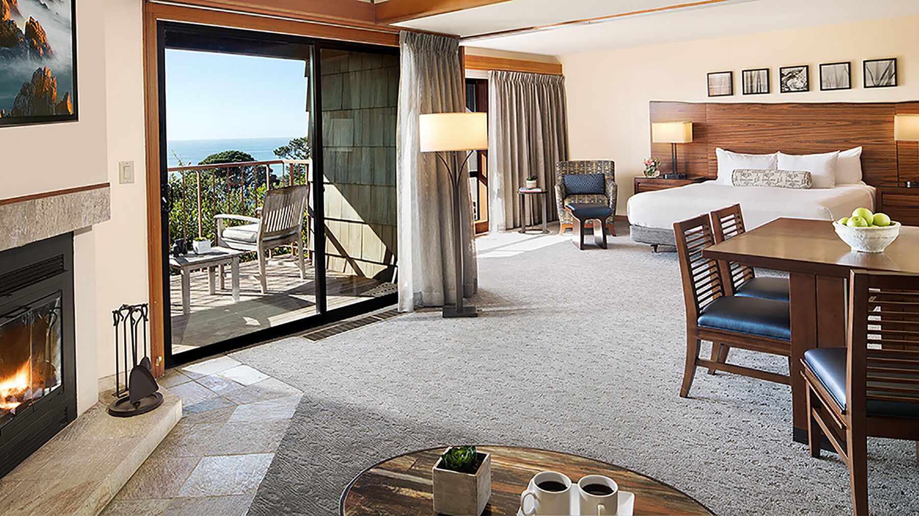 The villas at The Highlands Inn epitomize luxurious living. Each one- and two-bedroom villa features a cozy wood-burning fireplace, breathtaking bay views, a fully equipped kitchen, LCD TV with cable and satellite, plush robes, marble spa bathtubs, Wi-Fi, and iHome stereo systems. Rich wood, marble accents, and upscale fabrics create a refined, spacious retreat.
