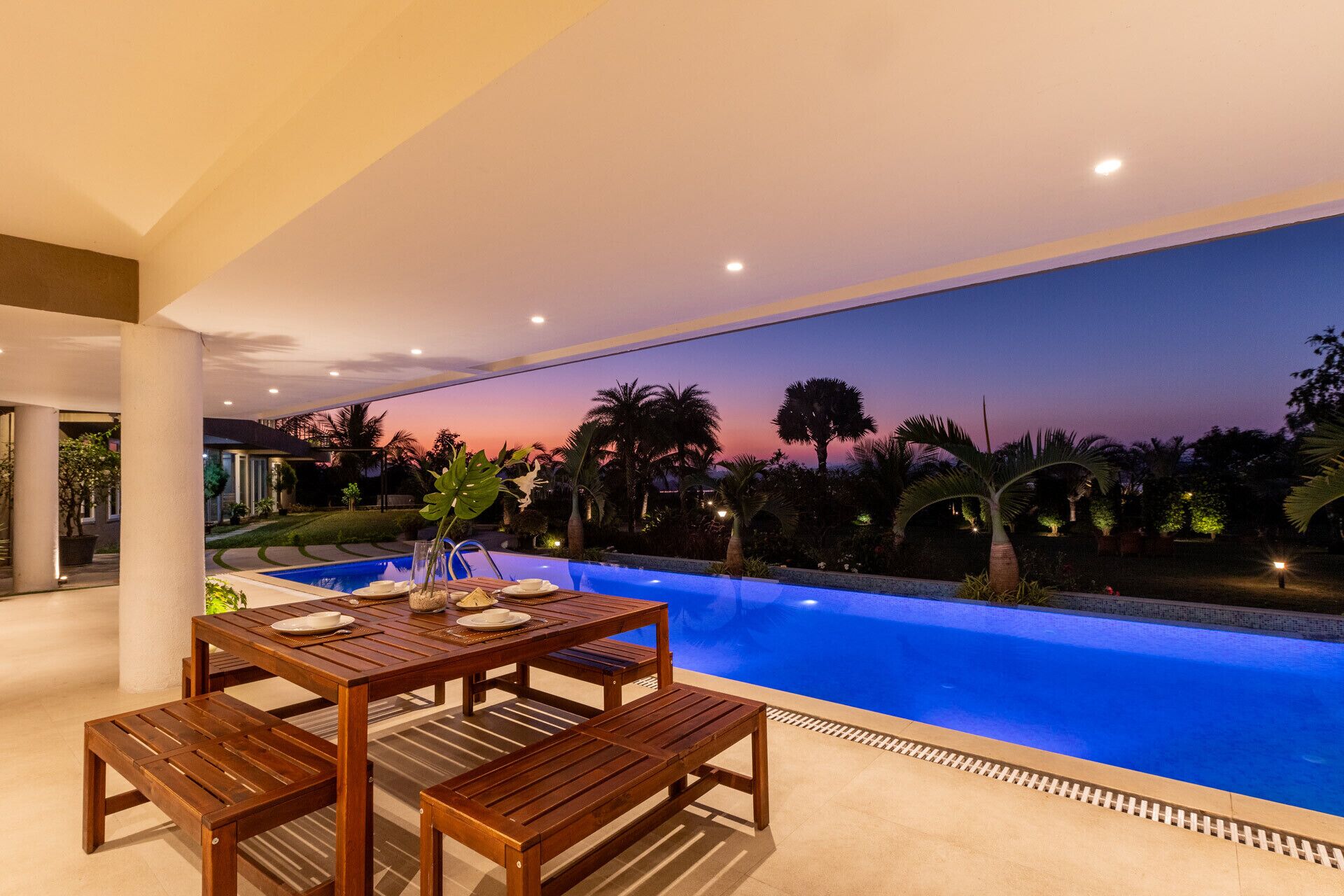 A beautiful villa surrounded by vineyards consisting 5 A/C bed rooms and equipped with swimming pool. A huge sprawling lawn for playing sports like cricket, volleyball, badminton and more. Experience nature to your fullest. Play indoor and outdoor sports heartily. The price is for total villa.
