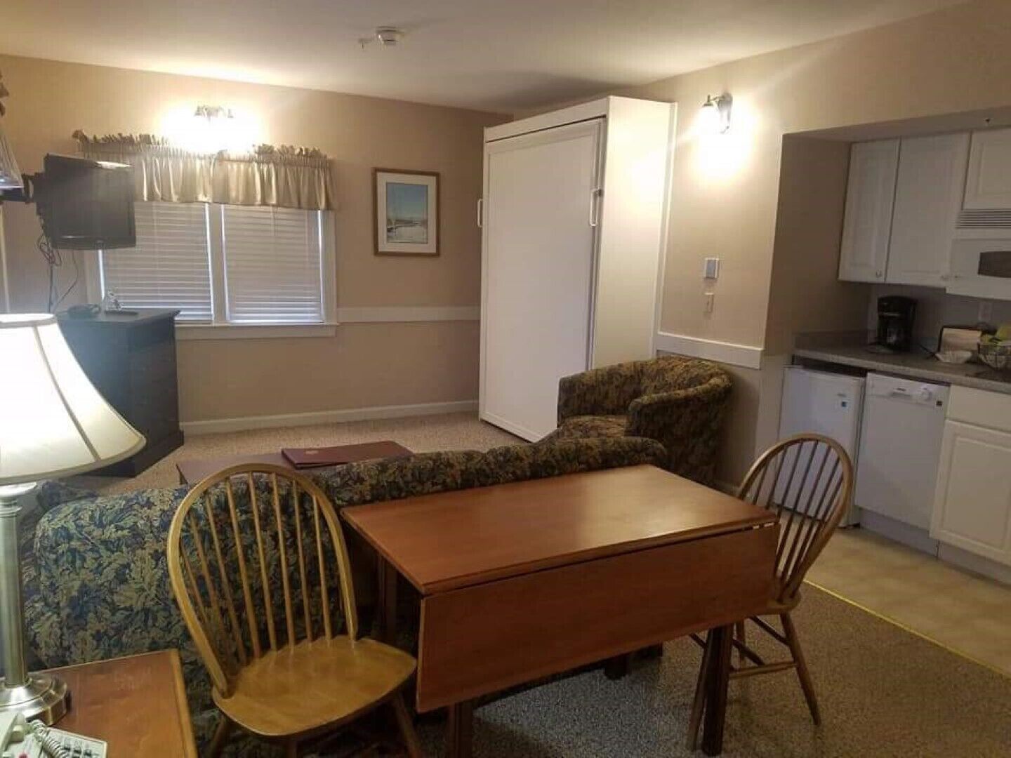 Two adjacent connecting rooms in the Eastern Slope Inn. An Efficiency with a small kitchen and a murphy bed and a standard hotel room with two queen beds.