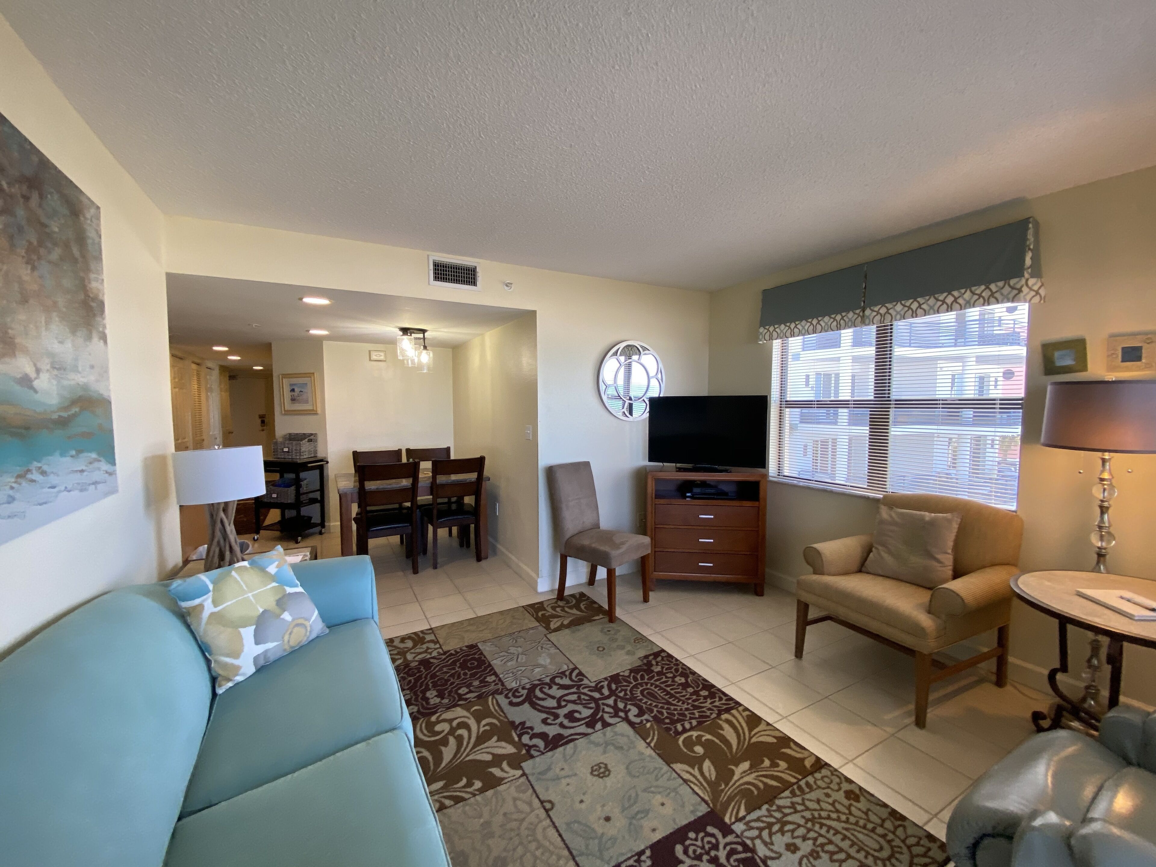 The Master suite offers a queen size bed and private entrance onto the balcony. The secondary bedroom has a twin over full bunk bed with a second bathroom in the hallway. You can find the primary entrance to your private balcony from the living area where the sofa turns into a Queen sleeper to accommodate a total of 6 guests. The fully equipped kitchen offers a refrigerator, oven, stovetop, microwave and garbage disposal. There is a coffee maker, coffee, blender, toaster, cookware, dinnerware and dining area to help you feel right at home!