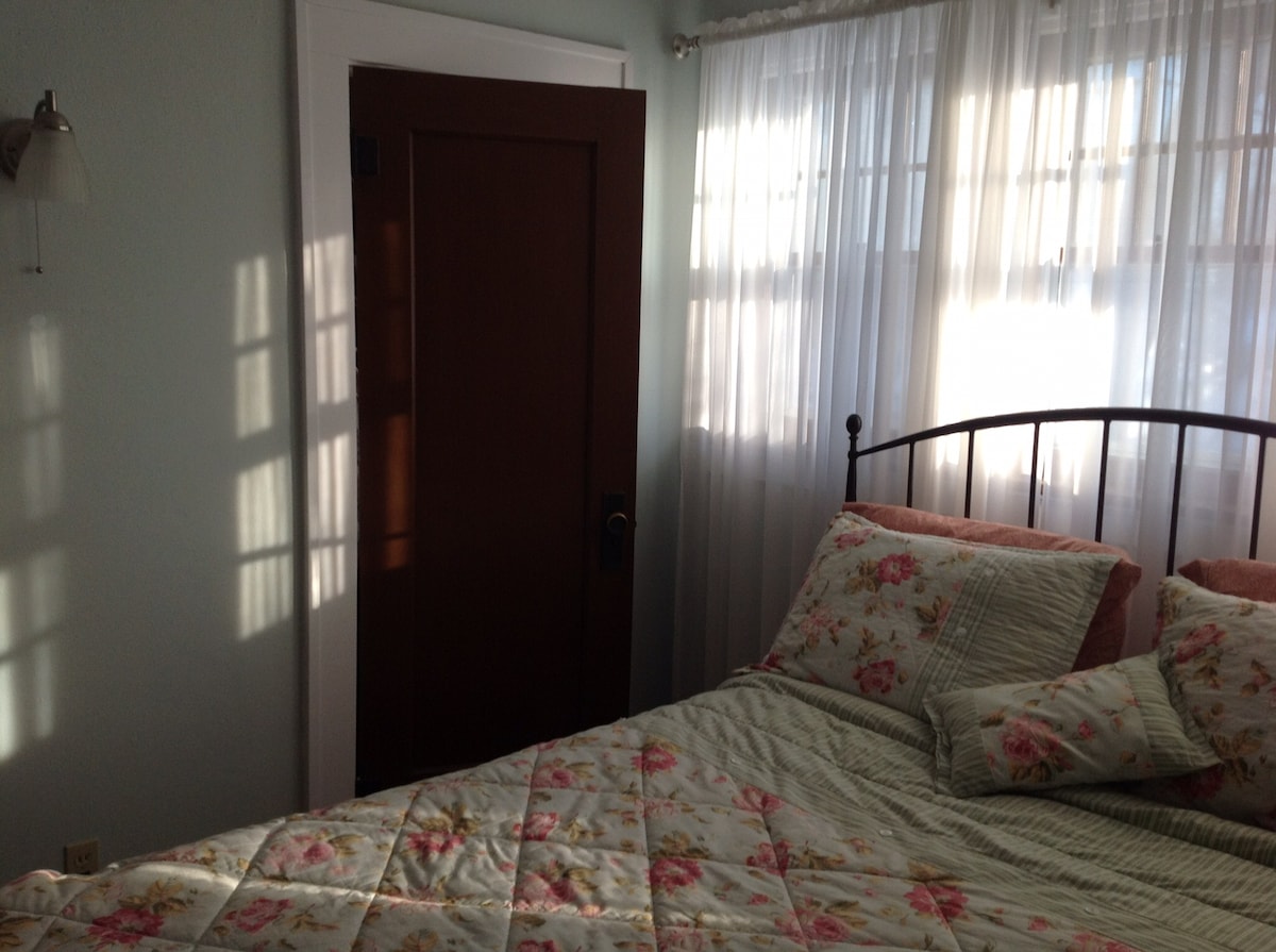 A spacious room with queen size bed, rocking chair in a corner with a special floor lap, desk, side table and two closets. The four south facing windows provide light and a view of the front yard and street. It is close to historic down town Ames, the bus, Bandshell Park, Mary Greeley Hospital and McFarland Clinic, the library, post office, City Hall and grocery store.