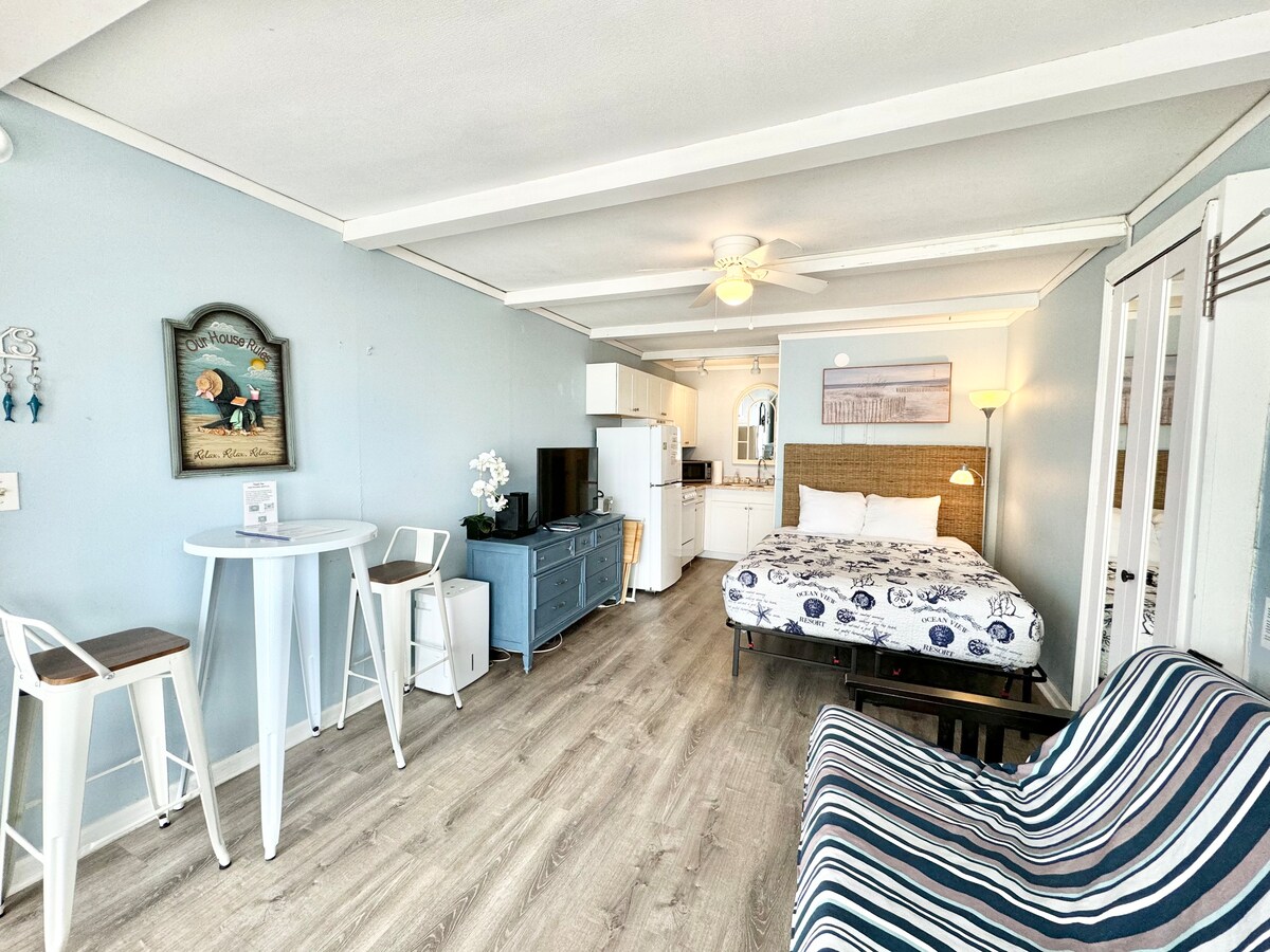Cute and cozy 300 sq ft 1 bedroom studio condo located on the quiet end of the island, Atlantic Beach, NC. Beautiful beach with amazing sunrises and sunsets. Less than 2 block walk to the beach. Enjoy your stay here with room for 3 adults Includes one double bed and futon. Additional amenities are 40”tv kitchenette with microwave, toaster oven coffee pot and dishes. Swim in the pool available to guests. Towels and sheets included with your stay. Parking available.