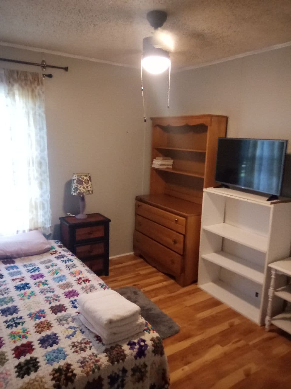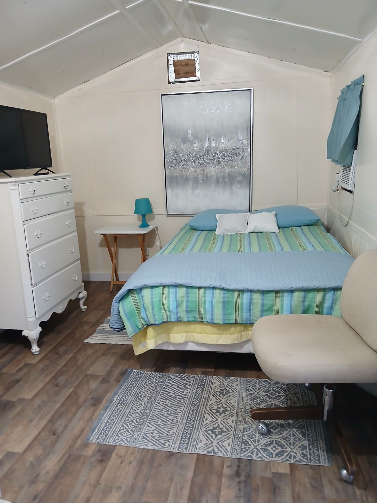 Bedroom with a queen size bed, and 40” television. Bathroom and toiletries. Screened back porch with ceiling fan(smoke friendly area). Kitchen for cold/hot drink storage and, use of the microwave. Extra pillows and blankets if needed.