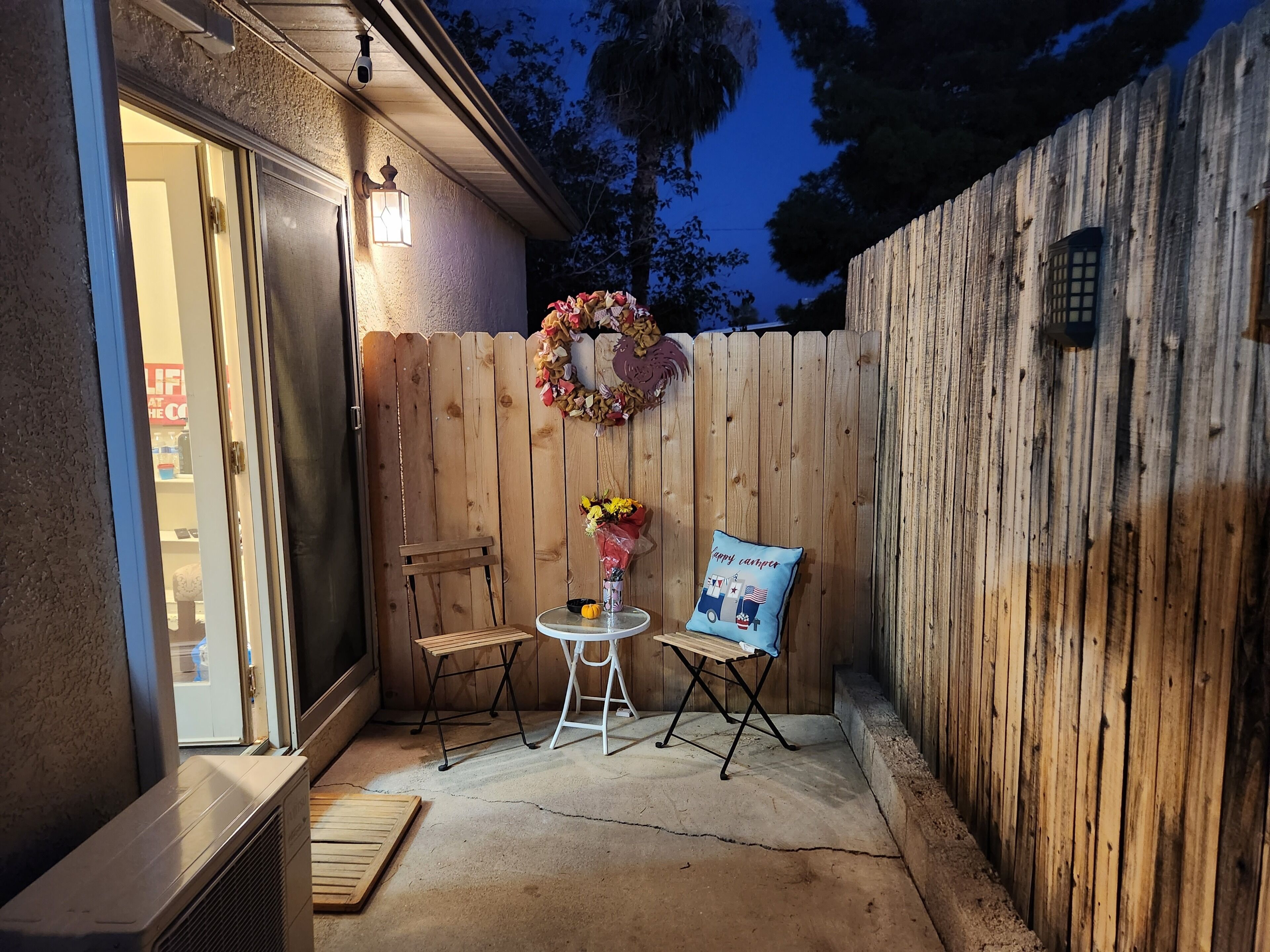 This room has a private entrance from the side of the house, is a private unit separate from the rest of the house, has a mini fridge, freezer, microwave, coffee pot, washer, dryer, and private bathroom. I will be in the main part of the house and available by phone if needed. Guests have full access to the backyard and I will turn on the fire pit or hot tub if requested. The yard is a great place to relax and have a drink!