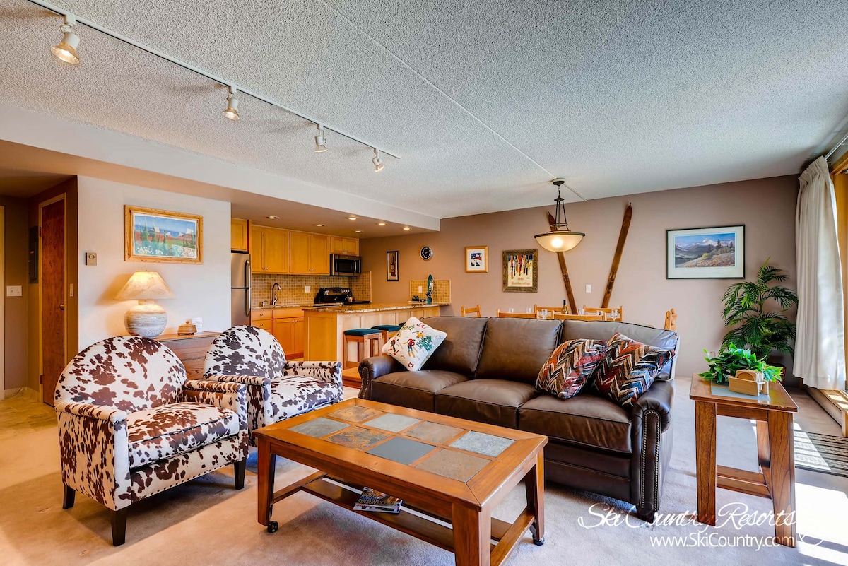 Escape to the serene embrace of Trails End Condo 203, a modern mountain retreat nestled amidst the picturesque beauty of Breckenridge. This inviting one-bedroom, one-bath ski-in/ski-out condominium (managed by Ski Country Resorts Vacation Rentals) spans 560 square feet and offers a warm and trendy alpine haven for your getaway.