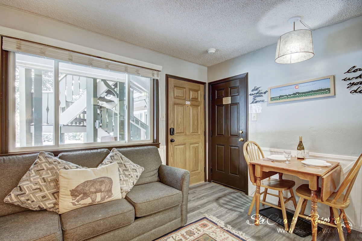 And, situated on the top (second) level of the Park Meadows Complex, relaxation and comfort take center stage at unit 7D. Furnished with a plush bed and sofa sleeper for additional sleeping space, thoughtful consideration to ensure a restful night's slumber was taken during renovations with the addition of *substantial soundproofing to all interior walls throughout.* Meanwhile, the 42-inch, 1080 HDTV and high speed internet service ensure entertainment is at your fingertips. Or, should you choose to enjoy a more soothing natural symphony to your stay, open the windows to enjoy a fresh mountain breeze and the calming gurgle of the Sawmill Creek that runs along the back of the Park Meadows Complex.