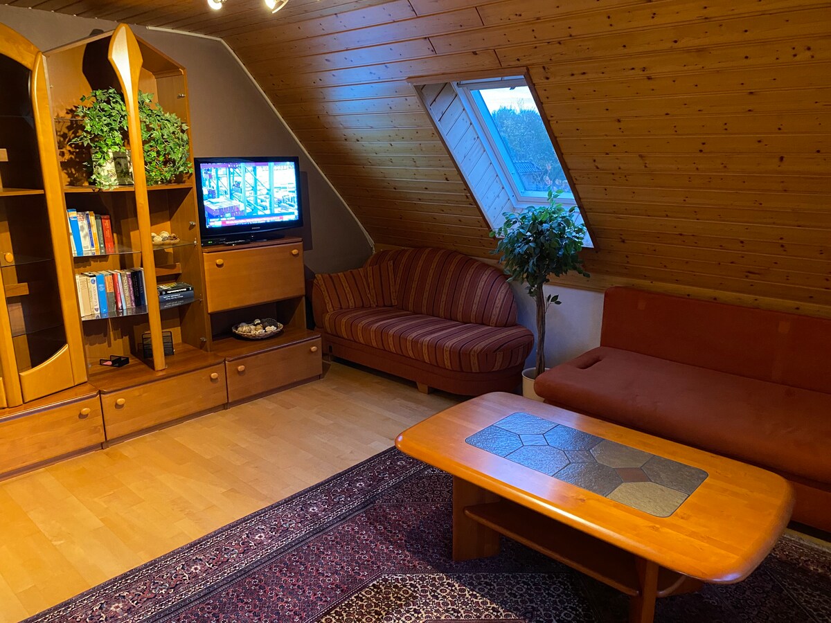 The apartment is on the 1st floor of our single-family house and is accessible via a separate staircase. It consists of a living room with a double sofa bed as well as a hallway and shower room. The living room is equipped with a double sofa bed, a couch table, a desk with chair and a small dining table. The 80 cm TV has satellite connection.
