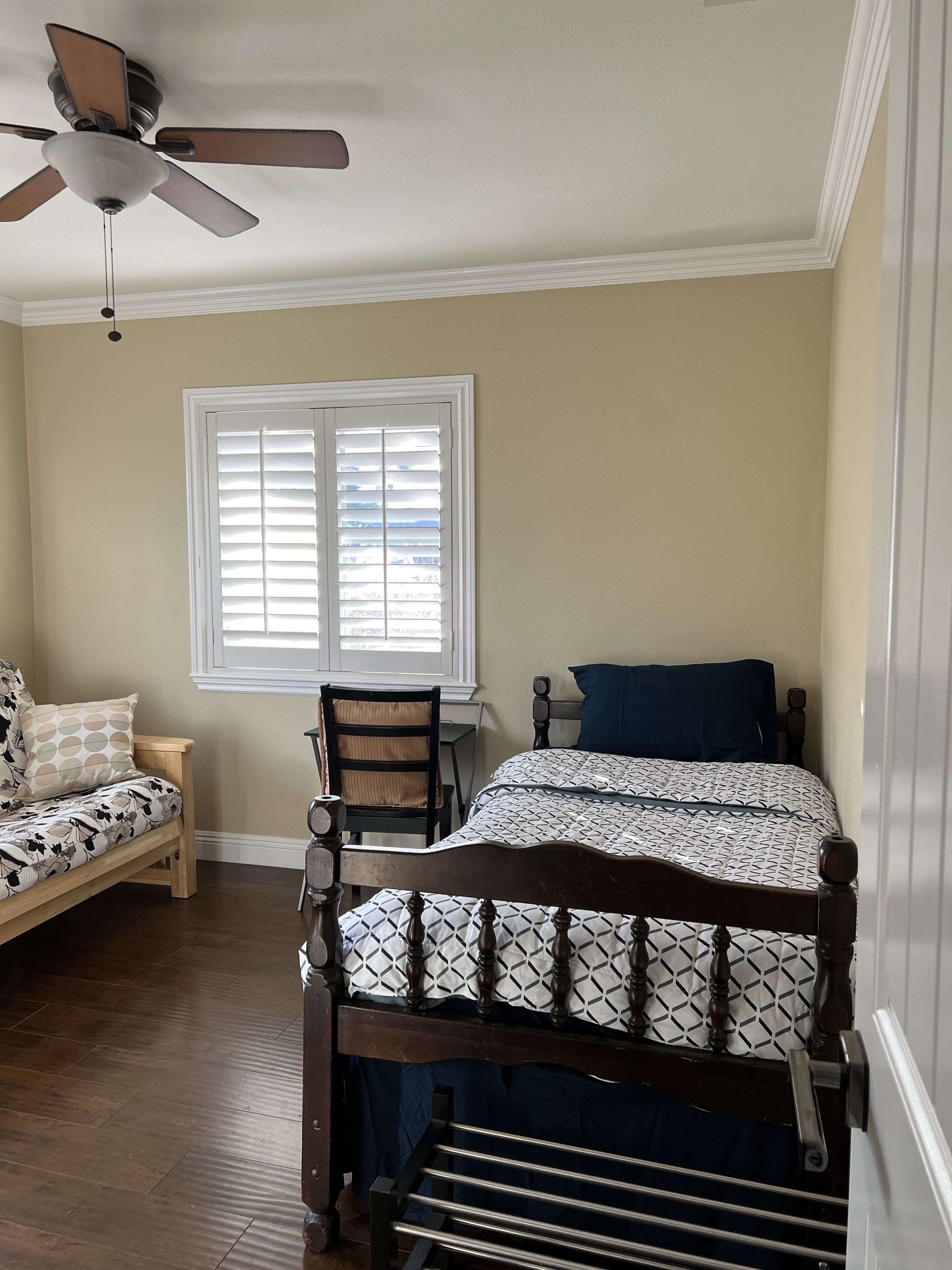 The master bedroom has an ensuite bathroom with its private entry, both on the side with the bathroom and the bedroom; it has a smart TV, a twin over full size futon bunk bed, an optional twin floor mattress, a chair, a mini split AC to control your own temperature, a printer, a medium sized stainless steel fridge outside for your bedroom underneath the attached patio cover where the pool is, a double closet, and a nightstand. The bedroom is located to the side of the house where the pool is located and is completely insulated against noise from our family or other renters, if no one else is using the pool.