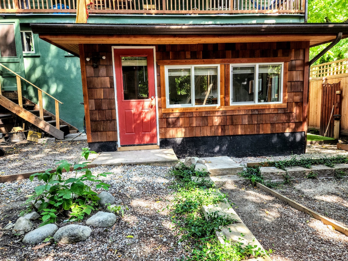 Private entrance with access to sunny garden & patio & BBQ. Comfortable queen bed and down pillows, bright dining area, basic kitchenette for warming meals. High speed Wi-Fi, HDTV with Netflix, private bathroom (with in-floor heating) & in-suite controlled heating. Secure storage for skis and bikes. 2 minute walk to rail trail, 15 minute walk to downtown Nelson. 20 min drive to WH2O.
