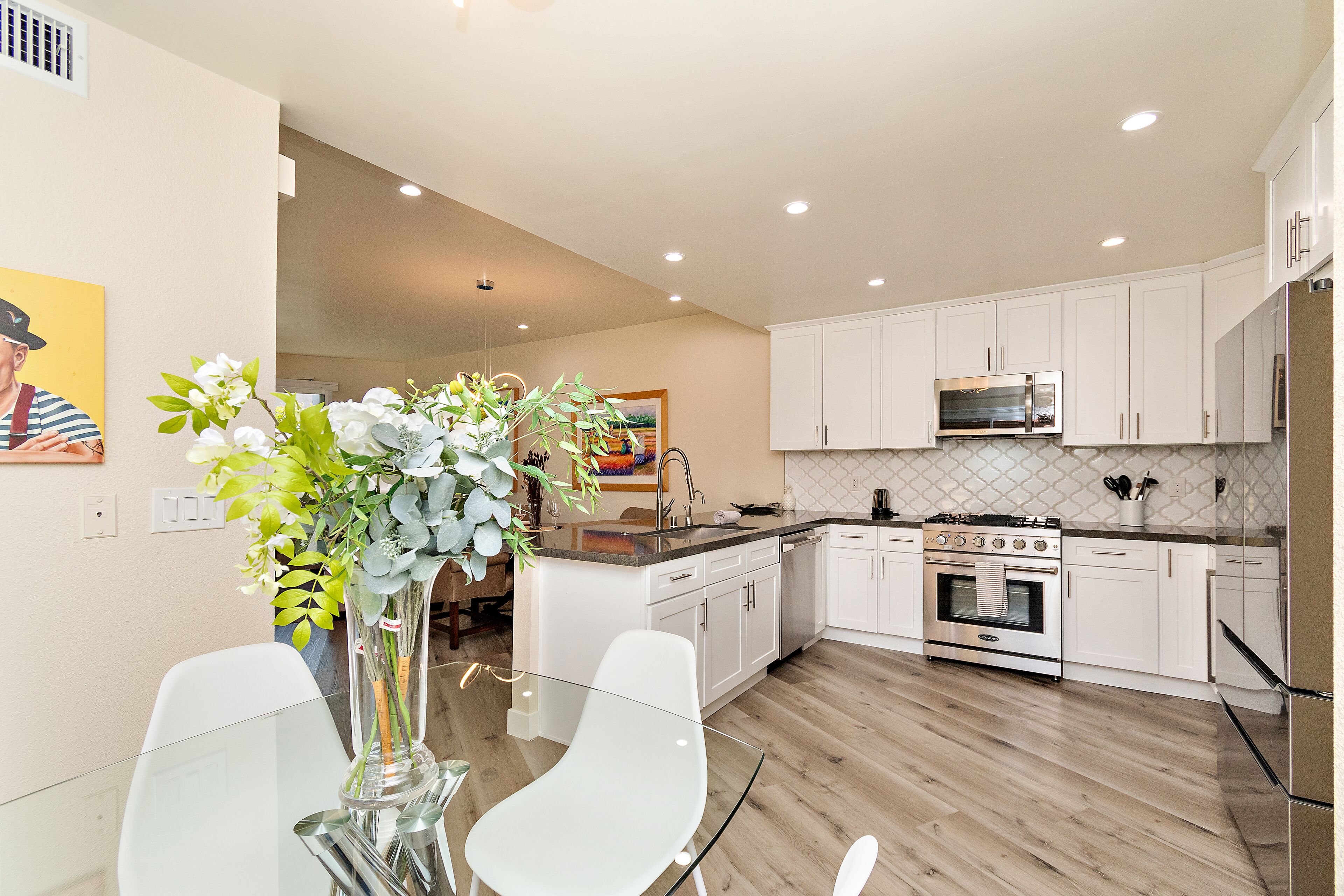 Whether driving into the 2 car garage or walking in through the gate, you’re welcomed into your private courtyard before getting to the front door of the house. From there, to the left is the great room with a comfortable living area with fireplace and flat screen TV, dining area with French doors opening out to the pool deck, and a well-stocked open kitchen with large breakfast bar.