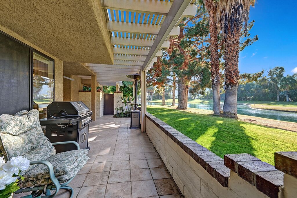 Minutes from Downtown Palm Springs, this spacious Cathedral Canyon Country Club condo makes it the ideal vacation rental with lake, golf course and mountain views. The home's large model, 2 bedroom split plan can accommodate the entire family with high ceilings, an open floor plan, large dinning patio and abundant views. In the formal living area the is a cozy fireplace, vaulted ceilings, and plenty of light from a large sliding glass walk-out. Adjacent, a large dining space with seating for 6, and a fully stocked kitchen with breakfast nook, and a complete wet bar with all the bar utensils and glassware. Just down the hall to the right of the entry the home's media-room boasts a large flat-screen HDTV and entertainment console and pull-out sofa sleeper. Further down the hall, the guest bathroom and bedroom with a king-size bed and flat-screen HDTV. Just off the living area is an enormous master suite with en suite bath, private patio, king-size bed and flat-screen HDTV. Other important features include, a large gas patio grill, outdoor standing heaters, in-unit washer and dryer, outdoor water feature, and charming grandfather clock. Guests at this unit can also enjoy the Golf Course, Clubhouse, Club Restaurant. and Heated Community Pools & Spas. With all the space an amenities offered here, this unit will book up quick. Click to reserve your space today!