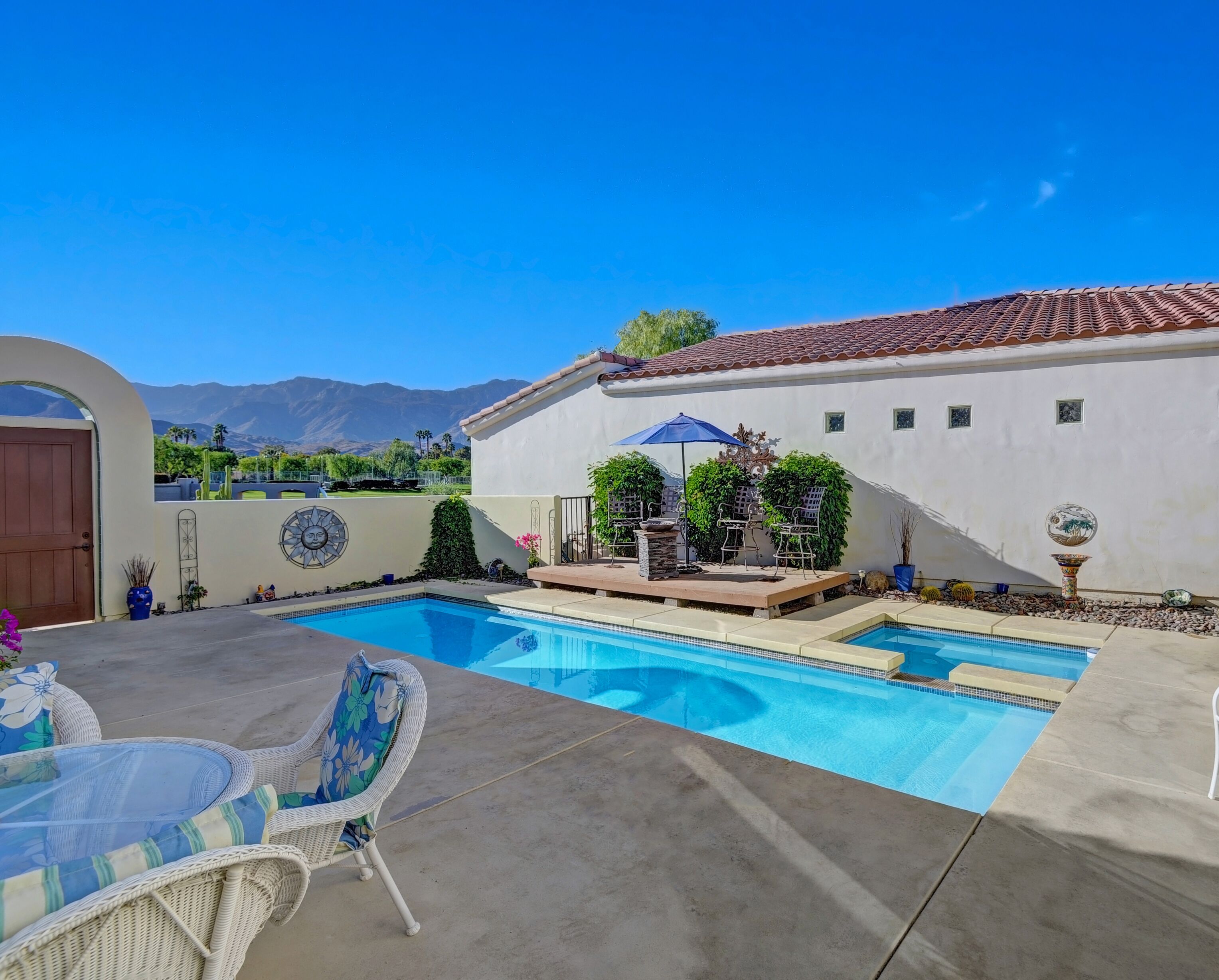 Welcome to this hidden jewel of a home in the guard-gated community of Rio Del Sol. Tucked away in the back of the community, this cute and comfortable 2 bedroom 2 bathroom home features a private pool and spa inside its own gated courtyard entrance from the street. From this private pool deck, you’ll enjoy the sunset view west to the San Jacinto Mountains. If you prefer the sunrise with your morning coffee, there is a back patio on the east side of the house just off the great room. Morning or evening, you’ll enjoy this peaceful jewel of a home.