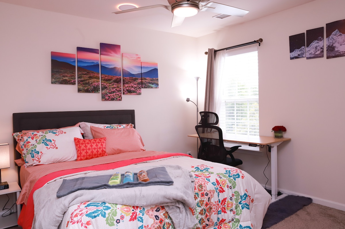 Modern cozy bedroom with private bathroom near Concord Mills, PNC Music Pavilion, Charlotte Speedway, UNCC, restaurants and dining, I-85 and I-485