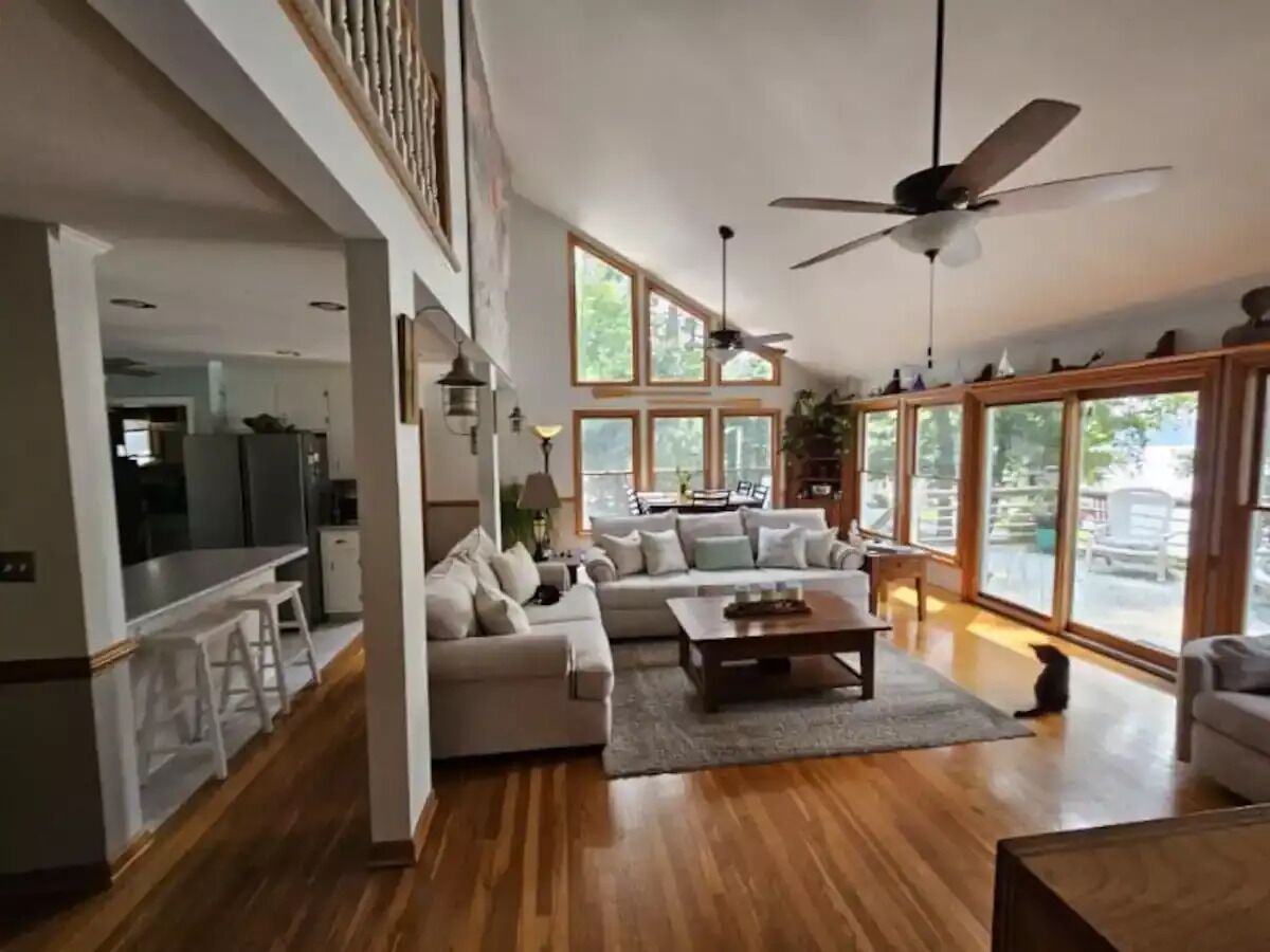 Relax in the cozy living room with a flat-screen TV, comfy sofa, ceiling fan, and open flow to the fully equipped kitchen featuring an island, coffee corner, and direct deck access.