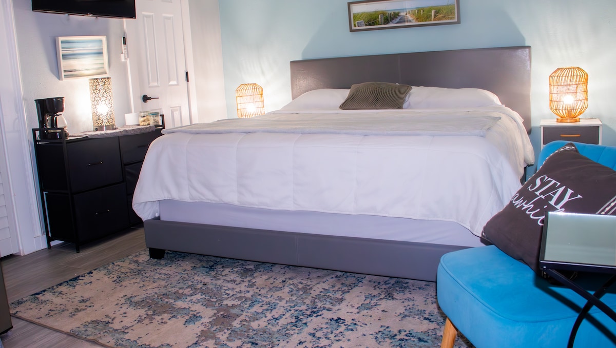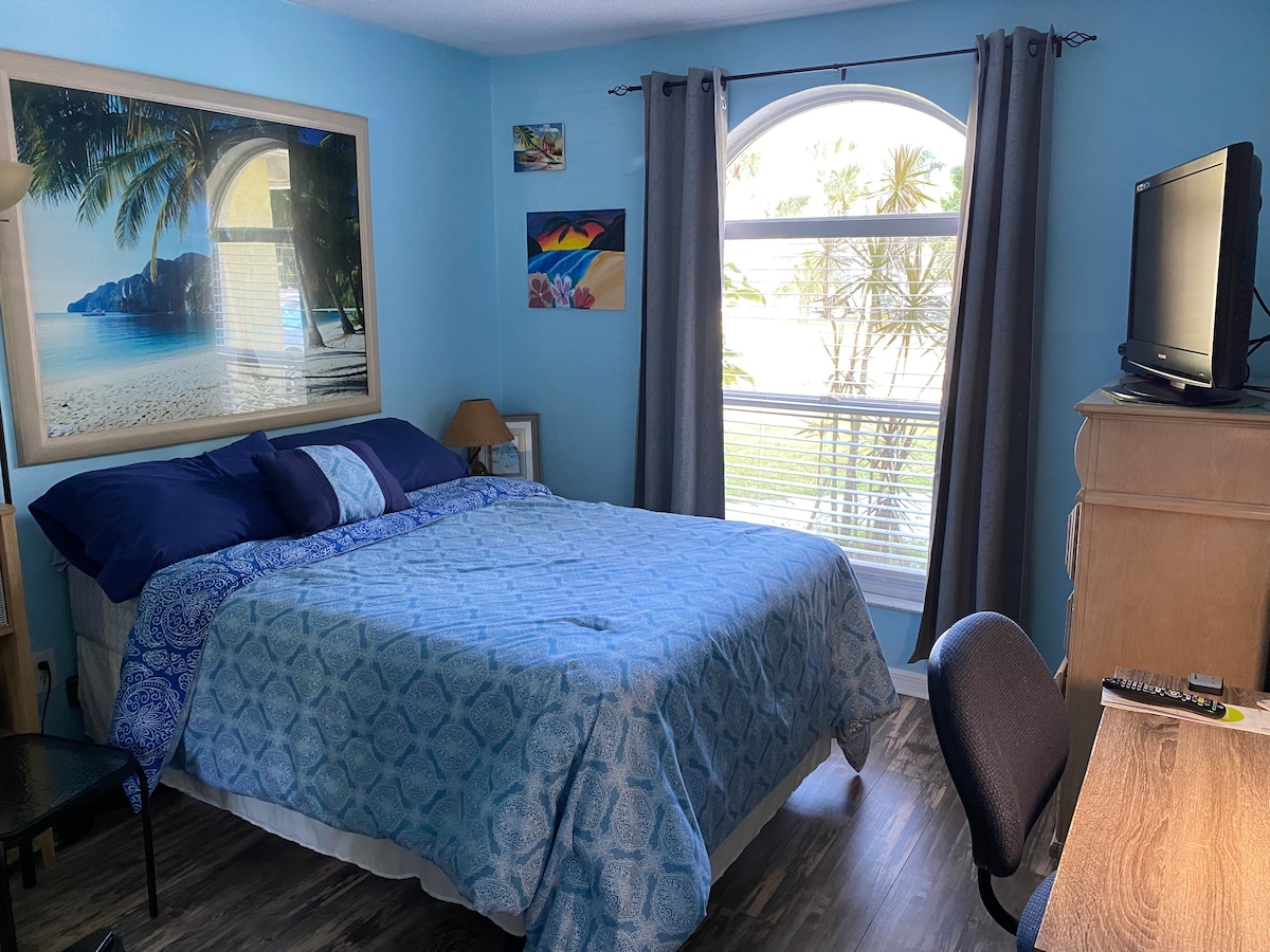 Clean, comfy bedroom and a bathroom. Home is close to beach and ALL EVENTS, with ample parking.