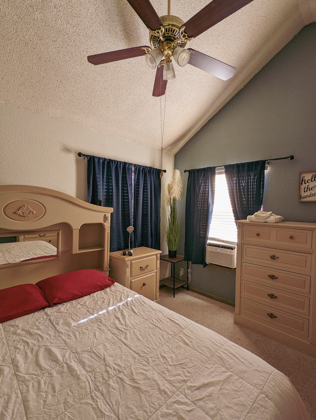 This vacation rental features air conditioning and a ceiling fan. The kitchen is equipped with a microwave, cookware, and a blender.