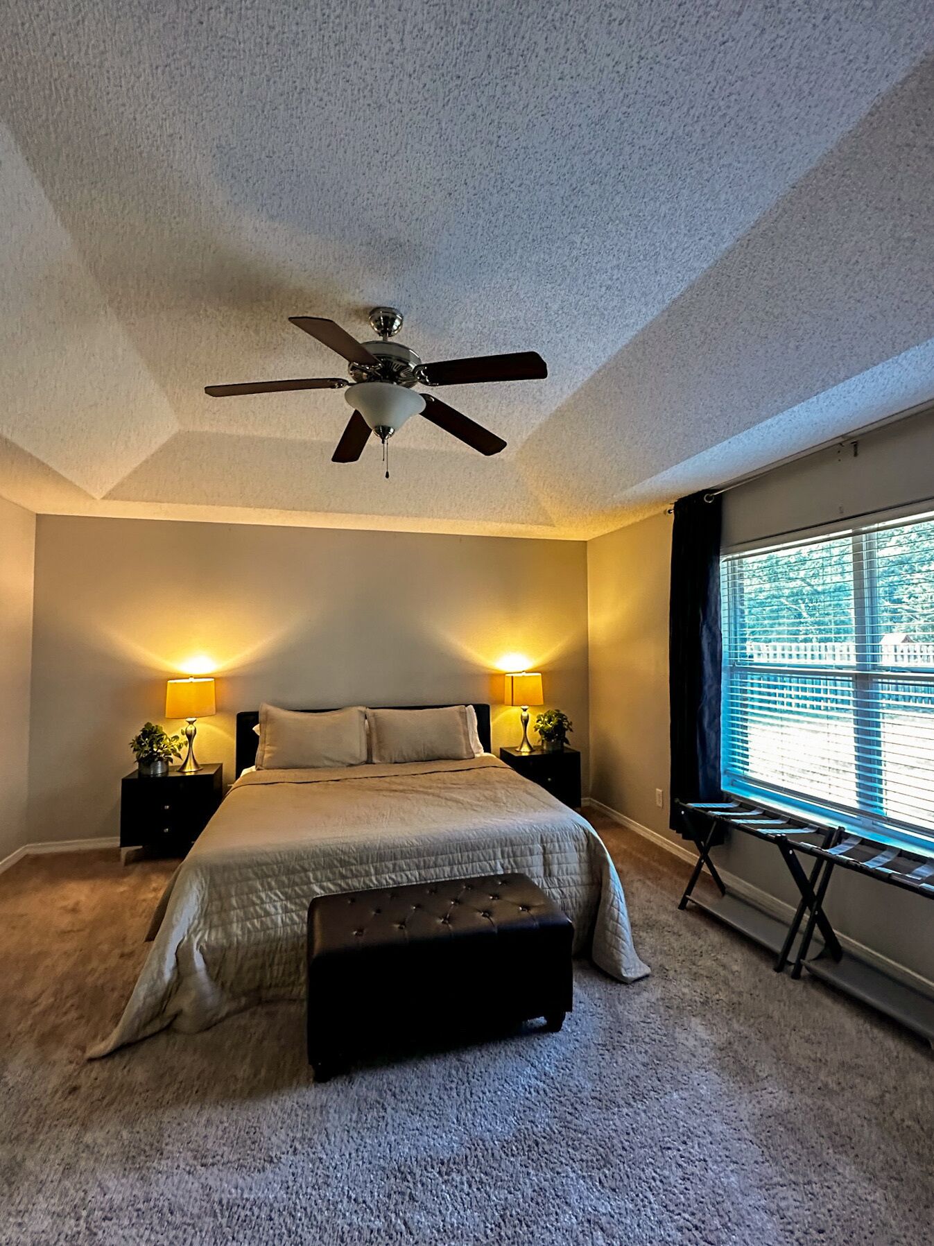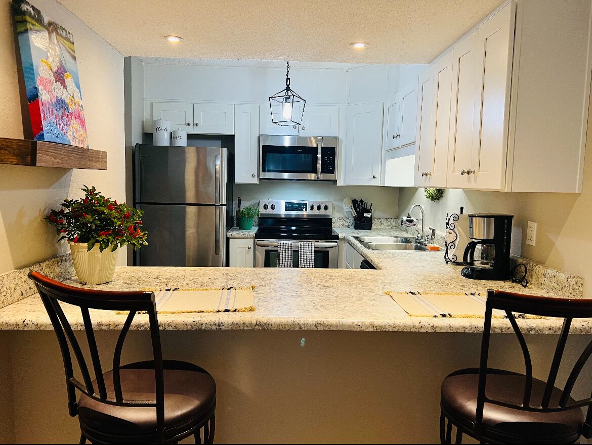 Inside, you’ll find a spacious, open-concept layout featuring a modern kitchen with granite countertops, a dining area, and a comfortable living room—ideal for gathering, cooking, and relaxing. The master suite is a true retreat with a king bed, double vanity, walk-in closet, and an adjustable-height desk for remote work convenience. The second bedroom offers a queen bed, while the third is perfect for kids or friends with two twin beds; these two rooms share a full bathroom, making it easy for everyone to refresh and recharge.