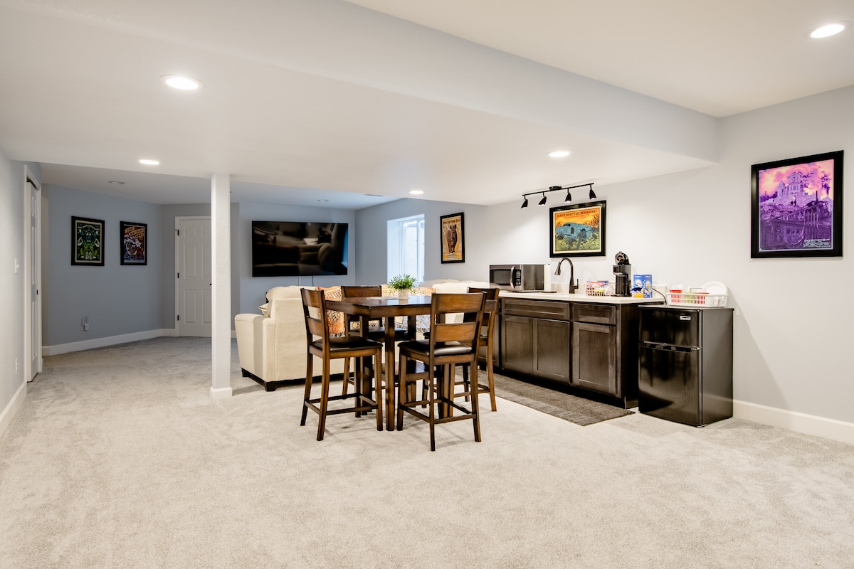 In addition to bedroom/bathroom, guests have access to basement wet bar area with microwave, sink, minifridge, coffee maker and table.