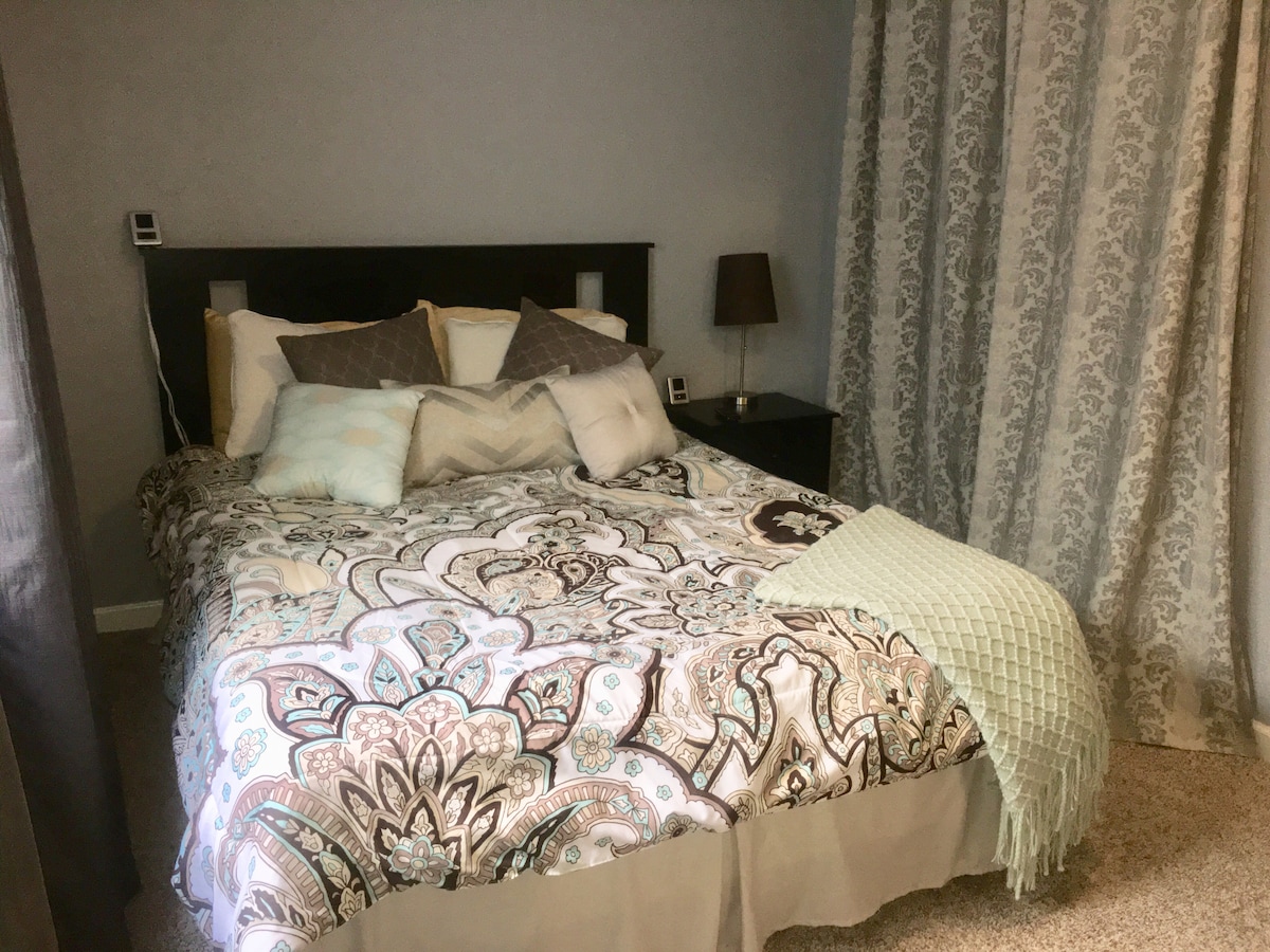 This is a quaint, comfy room, with a full- size sleigh bed, memory foam mattress. There is a closet, full-length mirror, heated blanket & fan. You will share the rest of the condo with another guest.