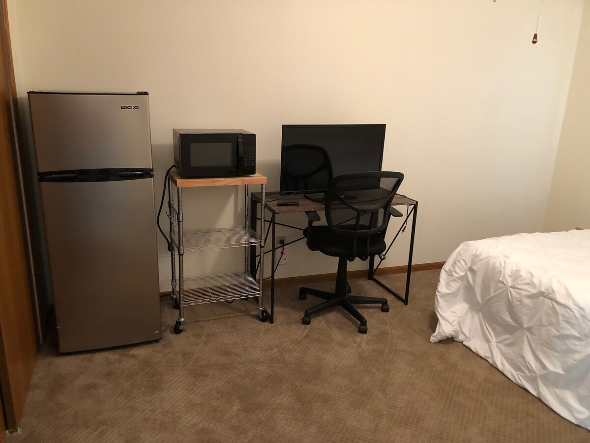 The bedroom is beautifully designed with a luxurious queen bed and desk for study. Kitchen has new appliances, table, and coffee for early morning wake-up. Kitchen and appliances are shared with owner.