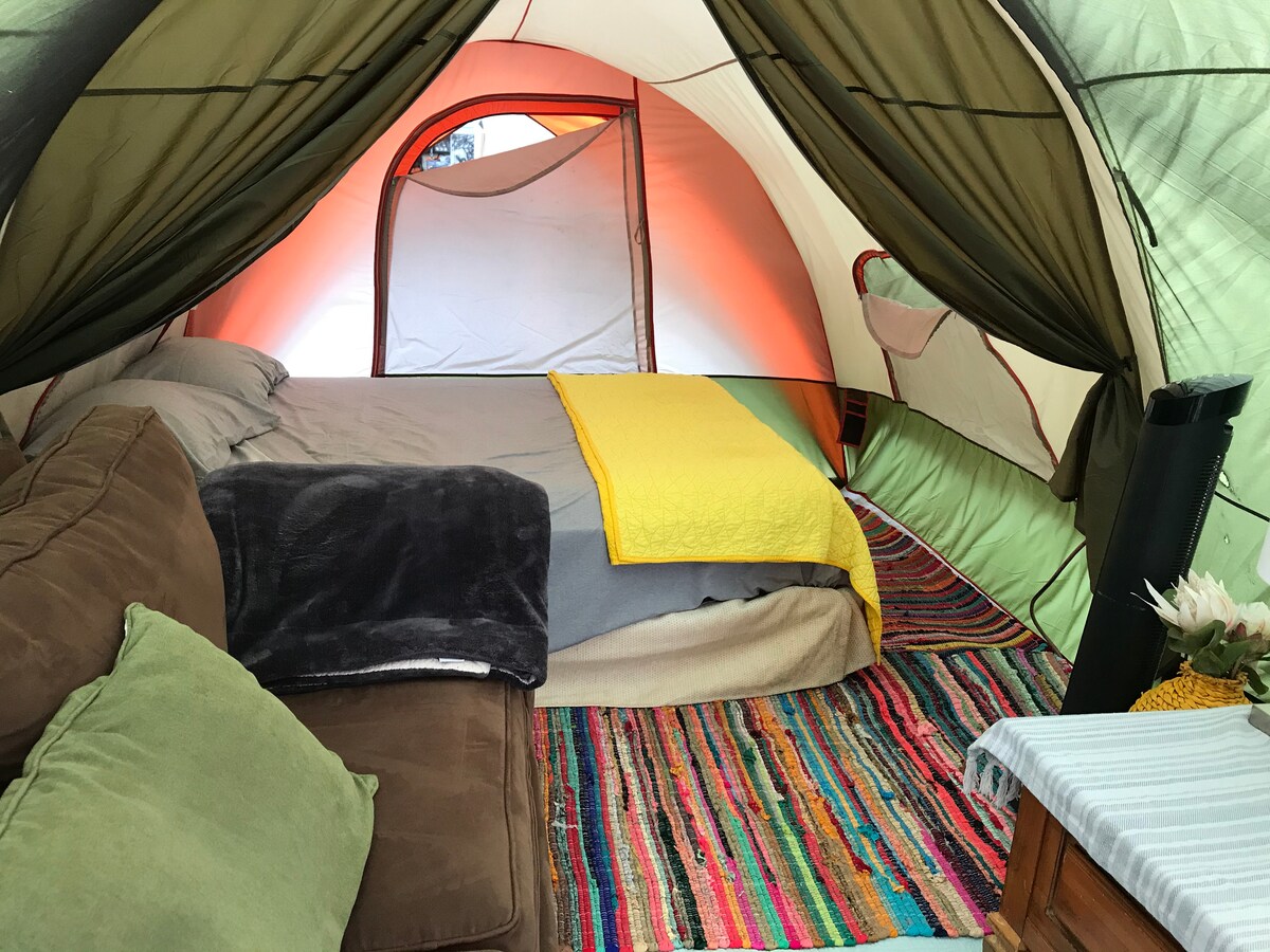 We are offering guests to use our community outdoor oasis for camping in a tent. Rental is for 1 tent and comes with a mattress and clean linens, a lamp and outlet. We welcome world travelers and if you’d like to squeeze more than 2 people we have extra sleeping bags. There is a refrigerator, grill and stove to prepare food. There are 2 showers, 2 sinks and a toilet, all are open air with no roof. We have bikes available, first come first serve. The beach is 3.4 miles and downtown is 1.3 miles.