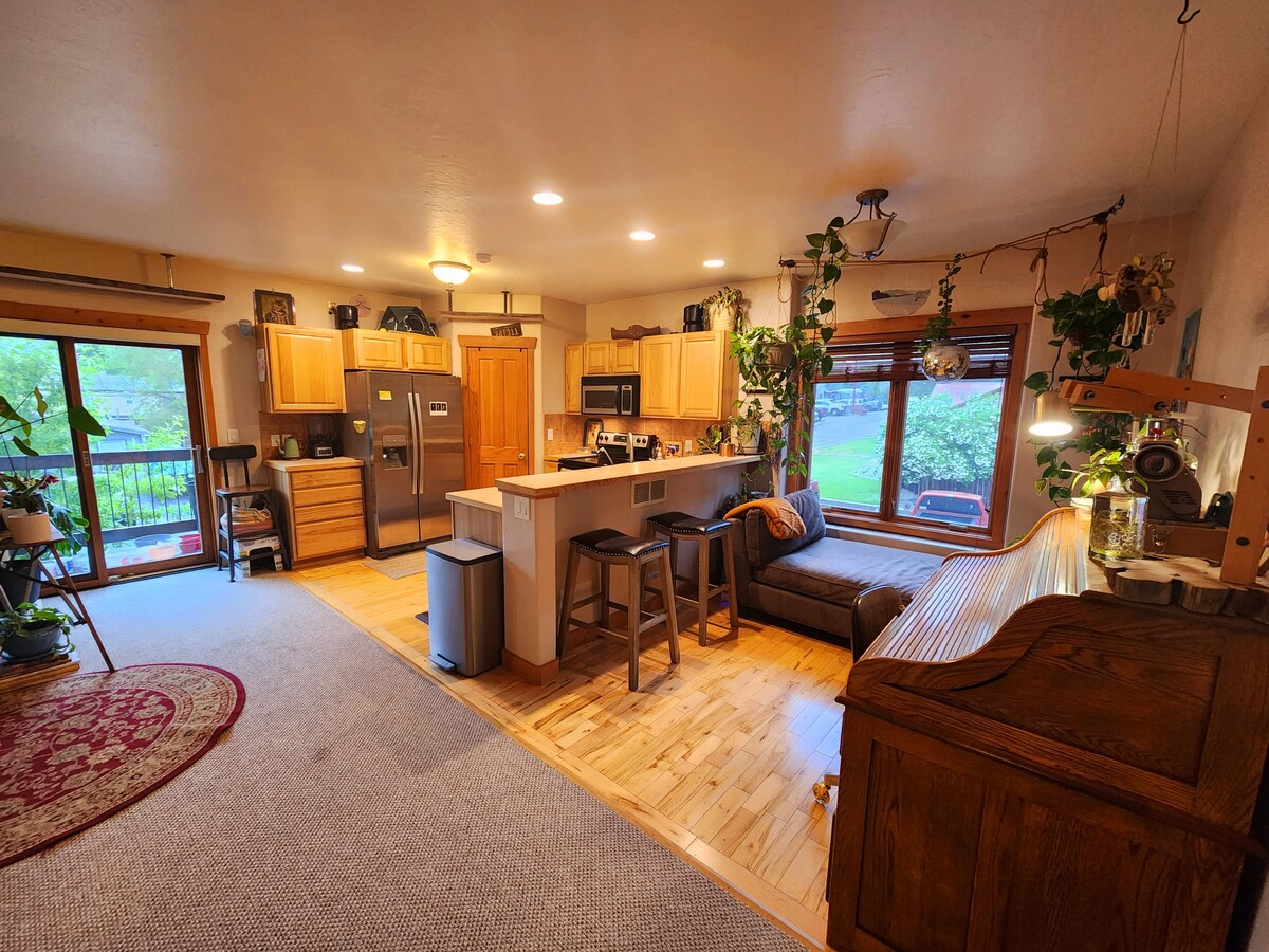 We live in a beautiful townhome with views of the mountainside! Our home is three levels, with 2 bedrooms and 2 bathrooms. Main level features an open floor plan including a comfortably sized kitchen, a cozy reading nook tucked underneath a large window, sunny deck with chairs, and a gas fireplace nestled in a cozy living room with a large couch. The bedroom is on the top level and furnished with a queen bed. The space is shared with us and 2 cats. We are clean, tidy and LGBTQIA+ friendly.