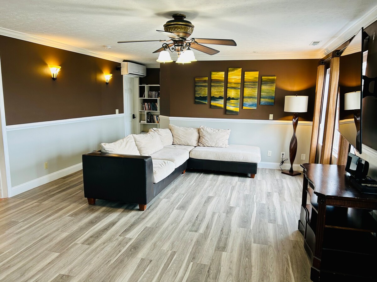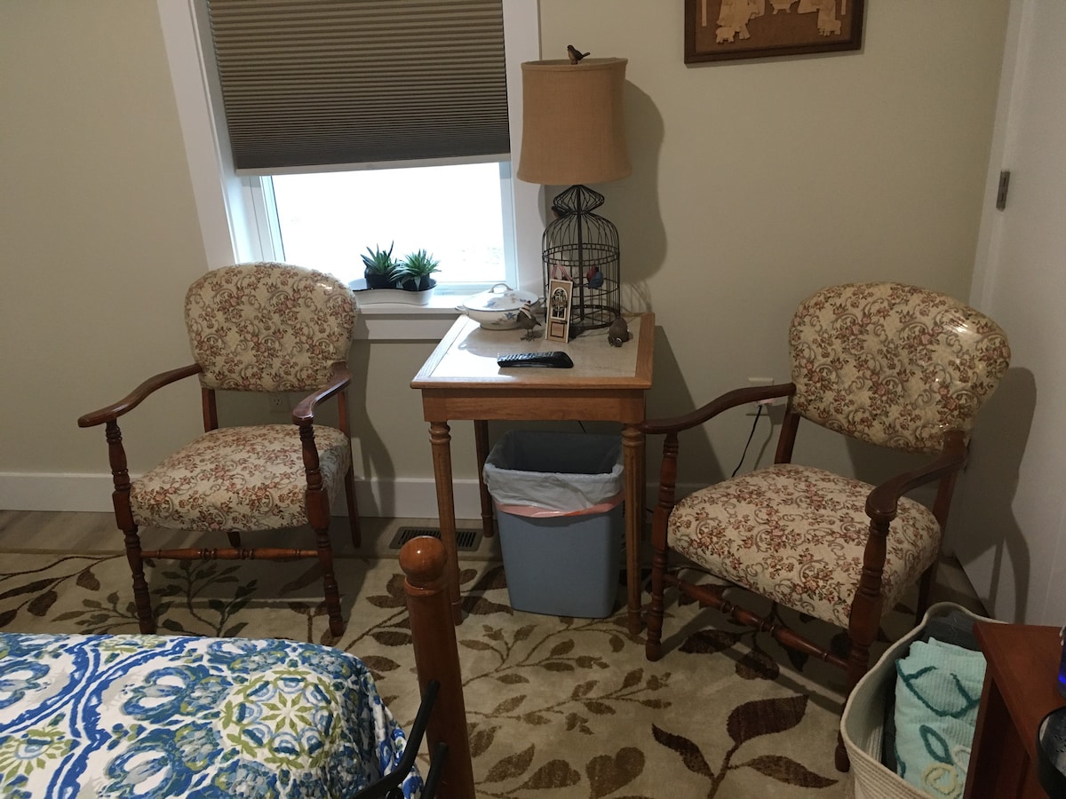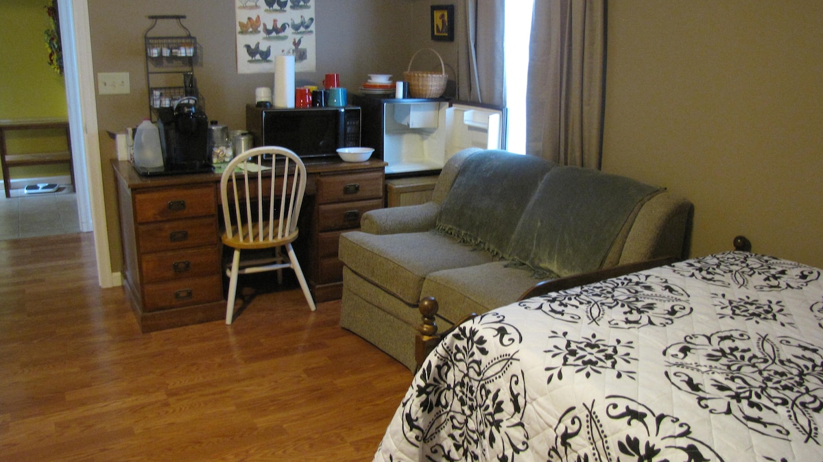 We have a spacious, clean, private bedroom with a private bathroom and a sitting TV room. The space has a private entrance and parking next to the room. There is a small refrig/freezer, a microwave, and a Keurig coffee maker with a variety of coffees/teas. We have fruit and snacks for you to enjoy in the morning.