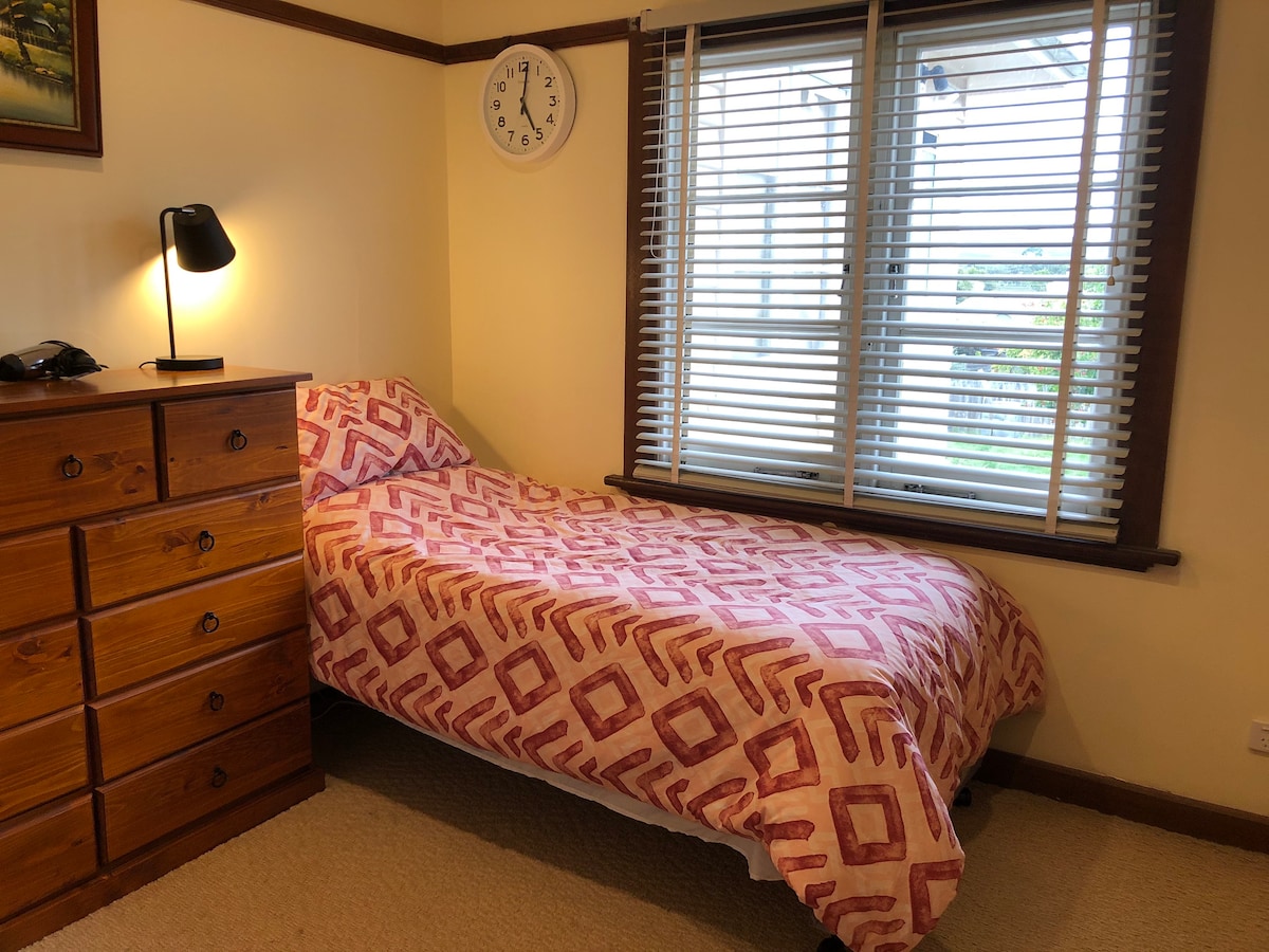 Polished timber floors in a renovated '70s brick house.North facing house so gets good amount of morning sun into lounge and bedrooms. Modern bathroom (shared),150 m to buses and supermarket.Comfortable king size single bed with electric blanket.Outside deck on north side.Off street parking available.