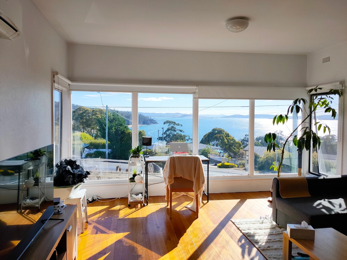 Set among the treetops in Mt Nelson surrounded by bush with wonderful views of Kunanyi. This cosy 2 bedroom home is 5 minutes from Hobart CBD and your room includes the use of a private bathroom. Situated in a quiet cul-de-sac, close to public transport and 5 mins from UTAS, the home is centrally heated and has NBN.
