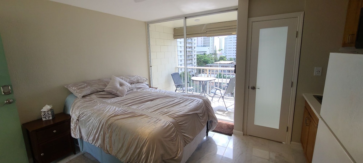 7 minute walk to the beach! This Studio is at the Ala Wai House property is located in the less busy part of Waikiki. Quick walking distance to bus stops, grocery stores, shopping and restaurants. Guests enjoy the rooftop deck with amazing views of the Ko'olau Mountain Range and Ala Wai Canal.