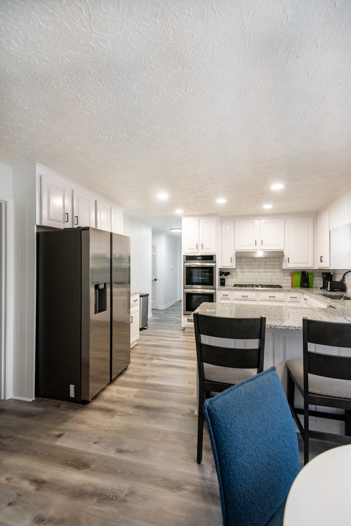 Starting with finished concrete floors, a dining area with kitchen, (we do not have a built-in oven, but there is a toaster oven and microwave), counter top electric stove, apartment size refrigerator with top freezer, plenty of cabinets and counter space.
