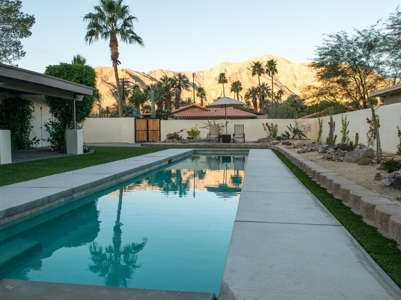 Villa Palmera - 1bd/1ba King Terrace w/Fireplace offers gorgeous views of the Santa Rosa Mountains and our sprawling desert courtyards. Our guests love the privacy of this single level villa and the convenient proximity to all the main clubhouse amenities that Legacy Villas has to offer. The main pool and children's pool are steps away from our front door. The main clubhouse is also where you’ll find our well equipped fitness center, clubhouse, outdoor wedding venue, hammock garden and Legacy Grille. If a quieter vibe is more you speed, then enjoy the quick walk across the hammock garden to the lap pool where you'll typically find adults in quiet relaxation soaking up the sun. With 12 pools and 11 hot tubs spread throughout the resort grounds, you’ll be happy to know that we have another pool and hot tub just beyond our front door where you will often be the only person there. So if you’re looking for a more social and kid friendly experience with roomy cabanas and pool side snacks at the main clubhouse or private relaxation closer to your villa, we have a host of options for you to enjoy the Southern California outdoors.