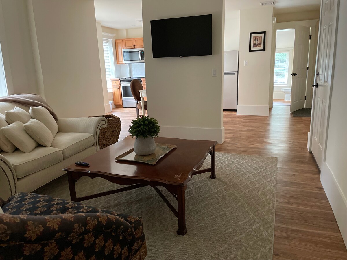 This suite is beautifully-appointed with a warm homey feel! It has a spacious living area and a full kitchen with basic kitchenware. There is one bedroom with a king-size bed. Rent included WI-FI and cable. There is reserved off-street parking. Please note that linens, towels, and toiletries are not included.