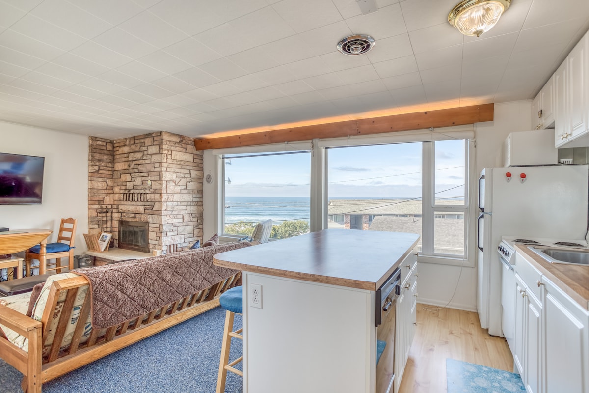 Picturesque waterfront views of Siletz Bay and the ocean inspire this beachfront top-floor condo that sleeps six. 180-degree panorama with the Three Brothers rocks adding to a mesmerizing bay view. Watch from the balcony for an ever-changing scene of harbor seal heads popping out of the water, wading water birds, or an eagle sweeping down to snatch a fish. Look west to see the ocean surf or a colorful sunset. Enjoy the cozy fireplace with a puzzle, a game, or a book in a comfy chair or watch one of the two smart TVs.