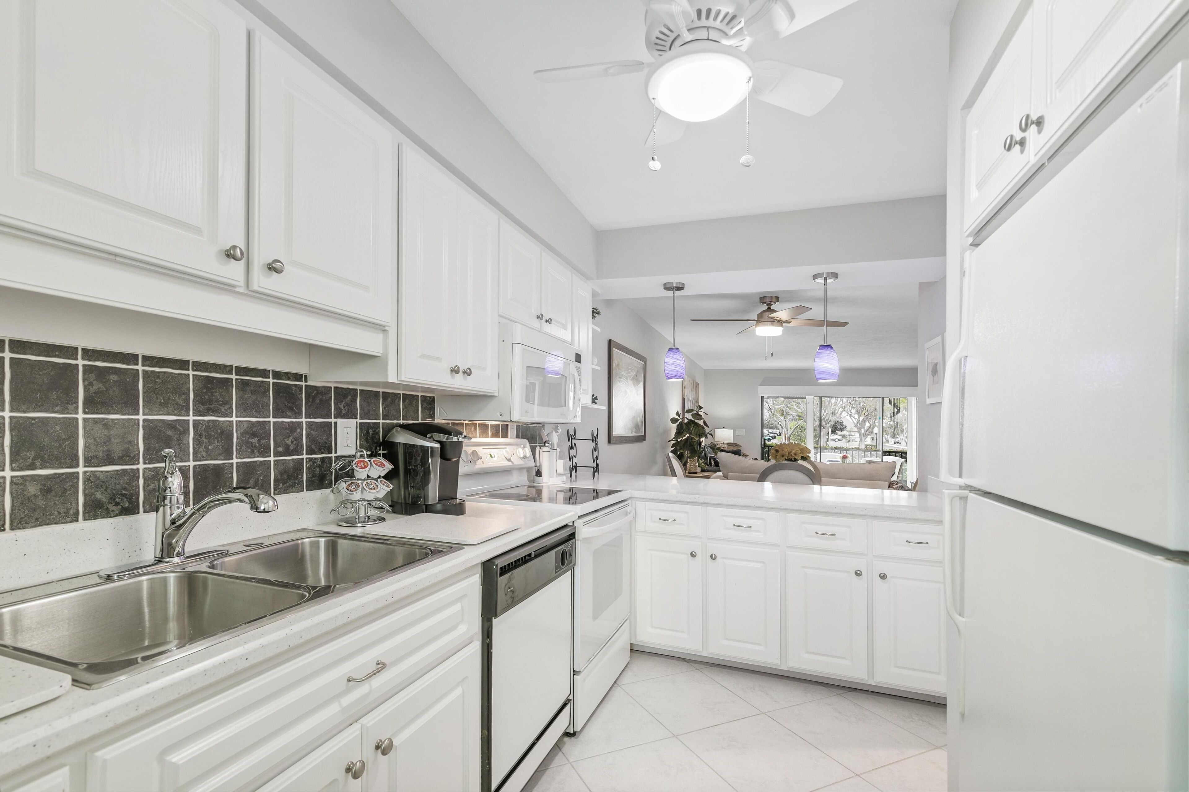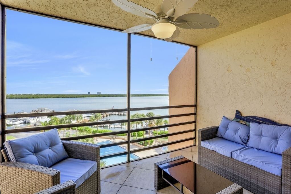 The sun-brightened kitchen contains all the modern appliances and cookware you need to prepare everything from a family dinner to a tray of cocktails to serve guests on the balcony overlooking the communal pool and Marco River.
