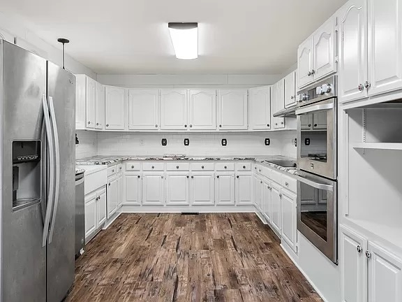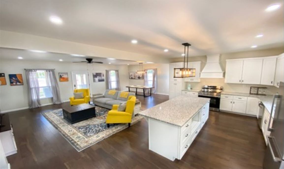 This home has an open floor plan that is designed for gathering together and enjoying the time to unwind. The living / dining / kitchen area is open and has direct access to the covered back deck + view of the private lake.