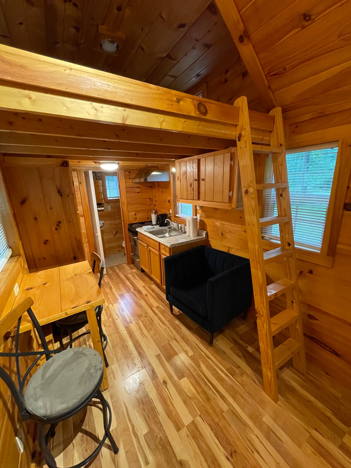 You will have access to the entire cabin for your stay. It consists of an upstairs loft with two queen-size beds on either side of the cabin. Cabin has a living room, dining room, kitchen and bathroom. It also has a wrap around covered porch front with a swing, and an open deck in the back with an outdoor table and chairs. The driveway goes to the steps leading to the cabin for easy access.