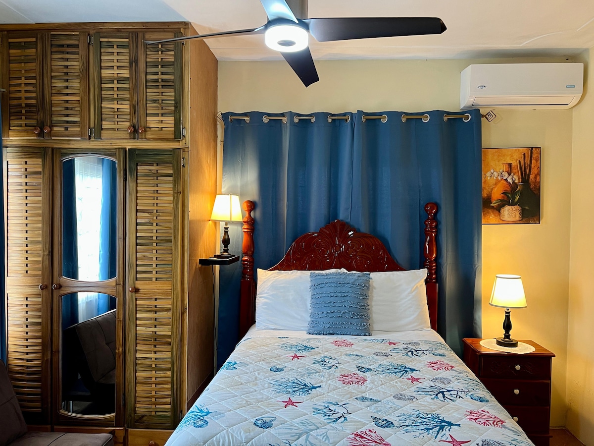 Traditional Jamaican style living. 1 bedroom, 1 bathroom ,4 Burner Gas Stove, Microwave/Refrigerator and 32 inches TV with mahogany furniture We are located in the heart of Ocho Rios with nearby local attractions such as Dunns River, Little Dunns River, beautiful beaches and more.
