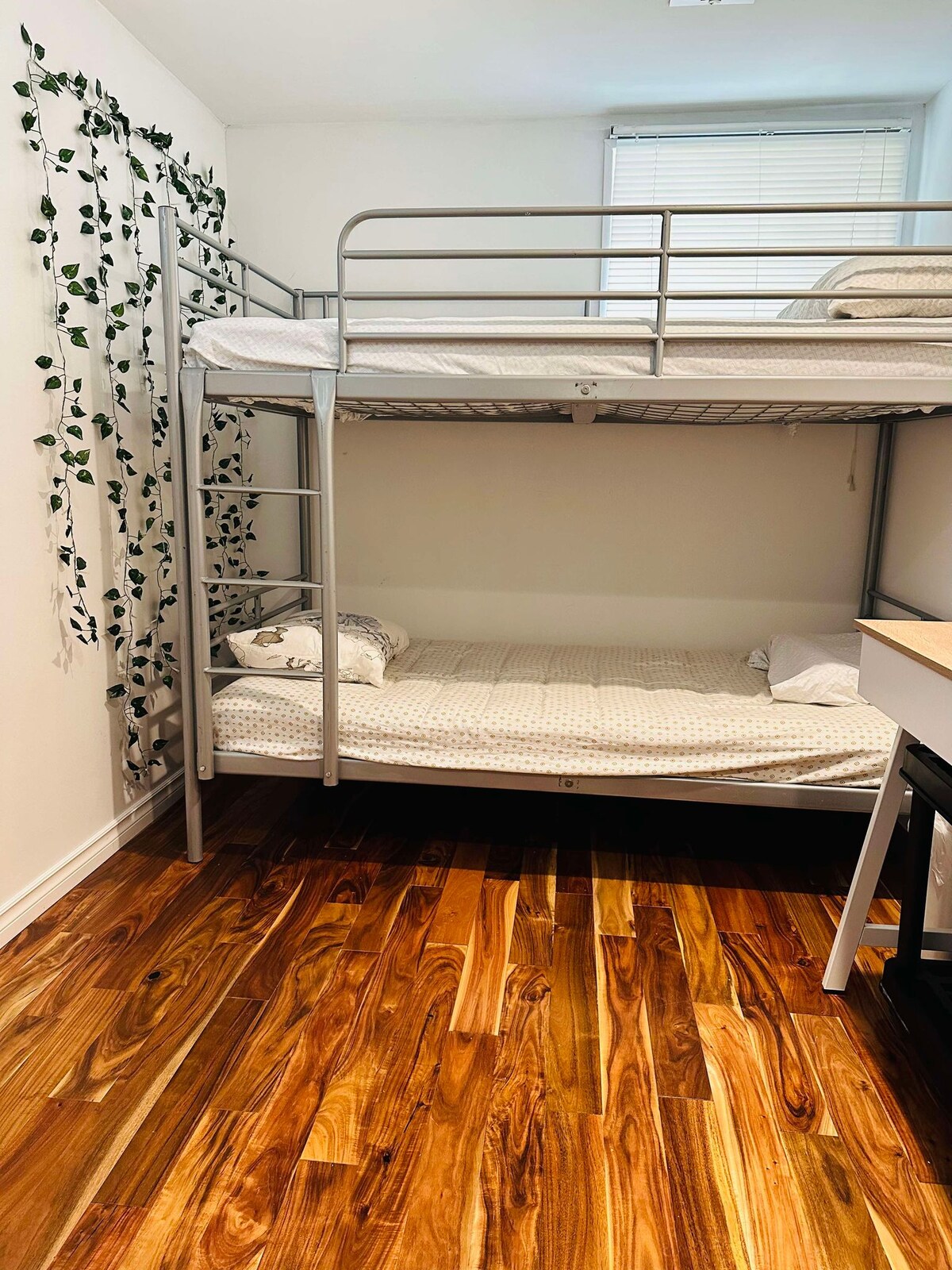 Welcome to our cozy basement retreat! This charming space features a comfortable bunk bed, perfect for a unique stay.