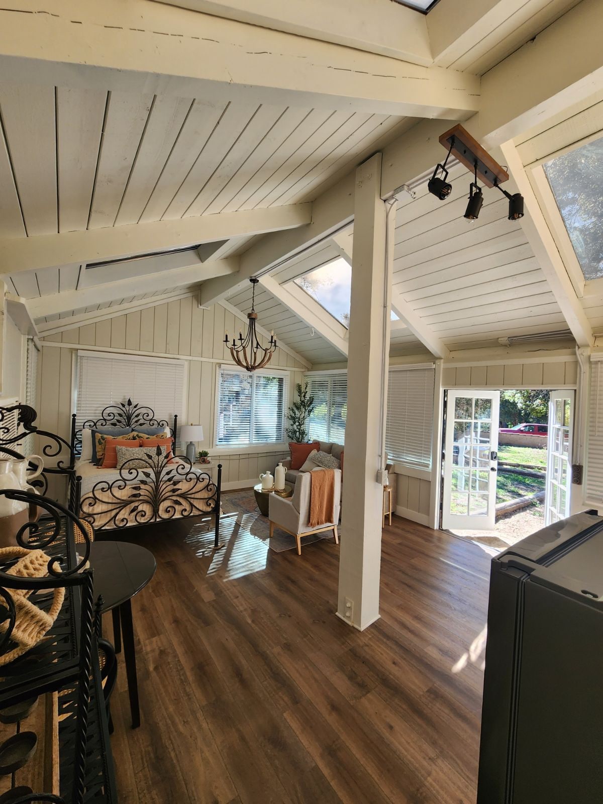 Guest Cottage 1200 sq. ft. with 2 bedrooms ( Queen Beds ) , 1 pullout sofa (twin). Sleeps 5 . 1 bathroom ( wheelchair accessible), living room, full kitchen, DW, Stainless steel frig, gas stove, high ceilings , large sliding doors to back yard , covered open air patio, very private fenced back yard. pet friendly, outdoor grill, private parking, beautiful mountain valley views, very quiet, property has 5 acres with private entrance.