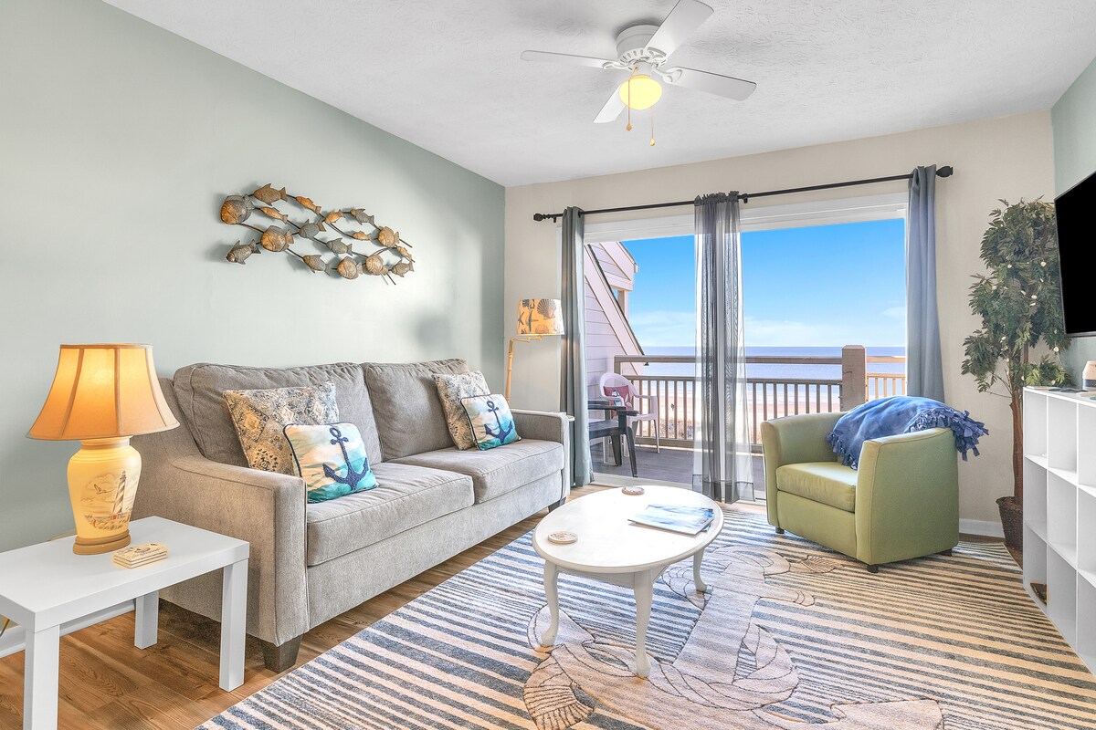 This first floor walkup condo has a beach cottage feel with all the modern conveniences. Load up your beach cart and spend all day chasing the sun (or kids!) between the pool and the ocean - they are steps away. An outside shower and a downstairs lockable storage closet means less sand and gear for you to worry about. Upon check in your linens will be fresh on the beds for you and hung on towel rods so that you don't have to bring them from home or unwrap expensive uncomfortable rental linens and spend the first hour of your vacation making beds (and this is included in the price of your rental without additional fee!) When the tides turn, settle in, watch TV or Netflix while you prepare meals on granite countertops in your fully stocked kitchen, and then have dinner watching the sunset from your private balcony. Blackout curtains, memory foam mattresses, and contemporary bedding mean the sound of the waves will be the last thing you hear before blissful slumber. The Oak Island Golf Course is right across the street or hop on a ferry in charming Southport over to the NC Aquarium in Fort Fisher. Whatever you do, unplug the stress at home and plug in your vacation treat yo self mode!