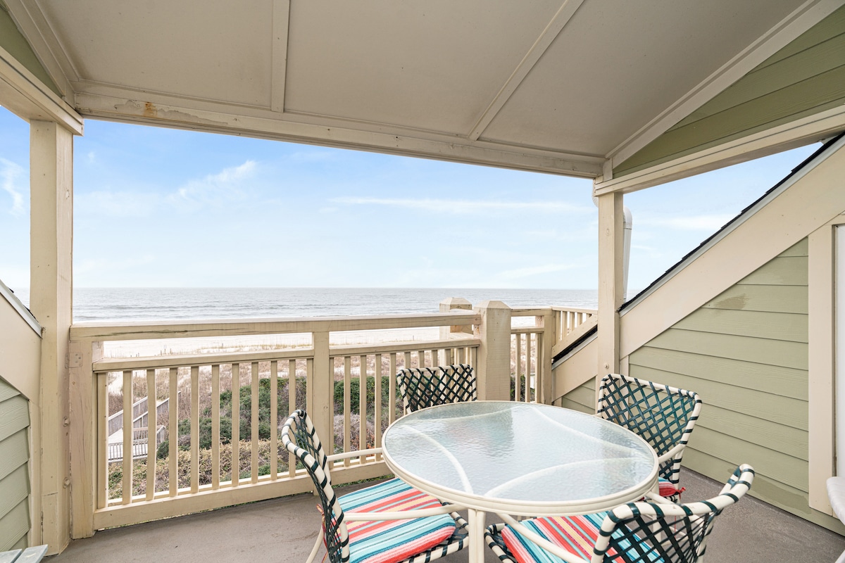 Private oceanfront covered balcony with furniture. Excellent ocean views. Walkway to beach, seasonal pool access, grilling area, outside showers on ground level and near pool. Ground level storage closet with lock. Across the street from Oak Island Golf Club and it's restaurant.